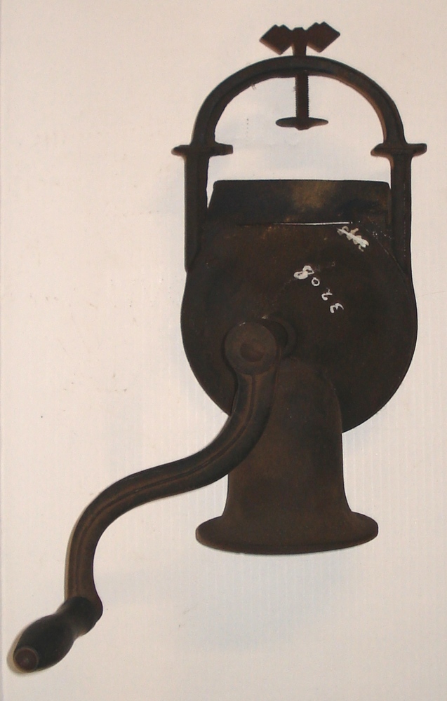 vleesmolens. Eén blauw gelakt model met klem voor ta...