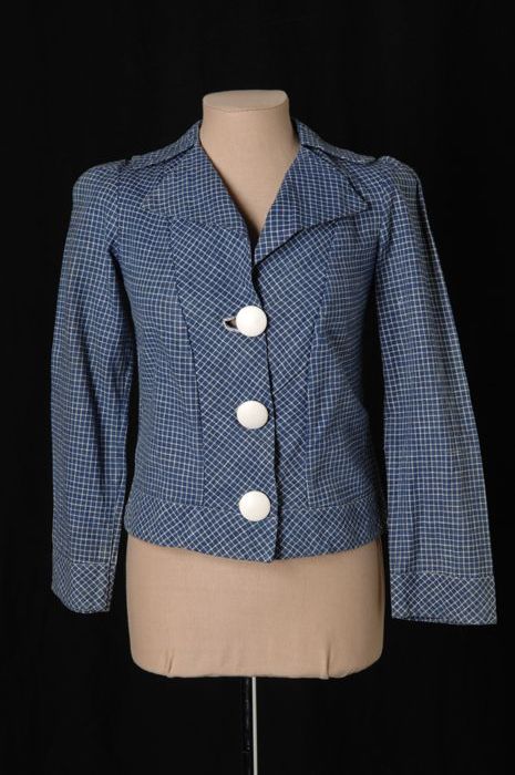 Blauw / wit geruit kort jasje met drie grote witte k...