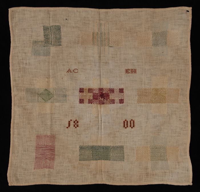 Merk- of letterlap, in diverse kleuren geborduurd