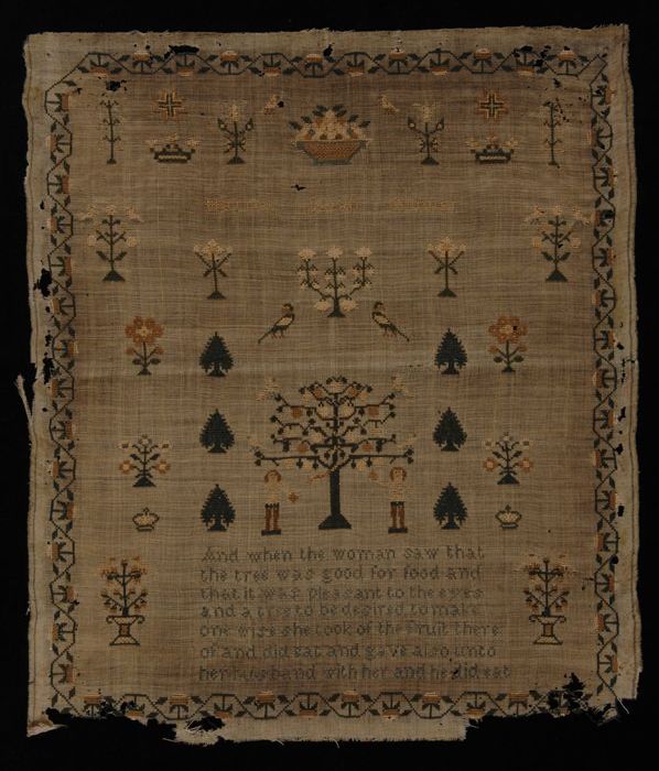 Vierkante merklap met onder meer Adam en Eva met app...