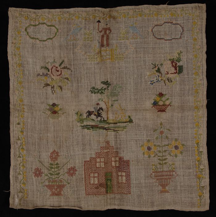 Vierkante merklap met bijbelse voorstellingen