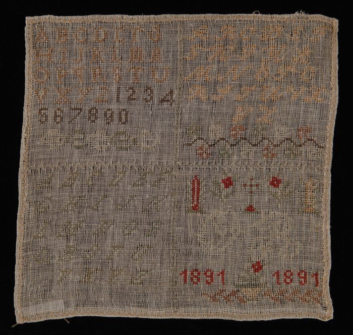 Vierkante merklap, met onder meer alfabetten