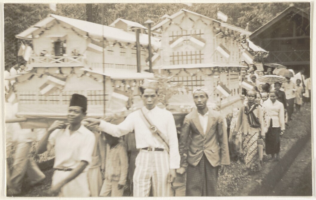 Optocht met Javaanse mensen die miniatuur gebouwen d...