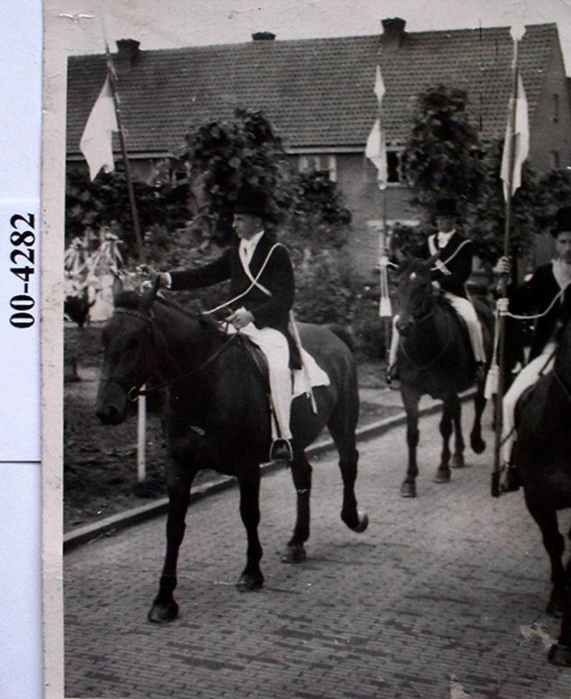 Drie ruiters te paard voor de optocht uit bij het Ma...