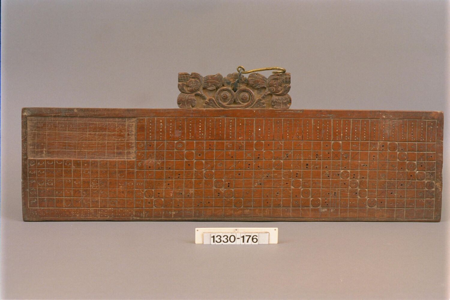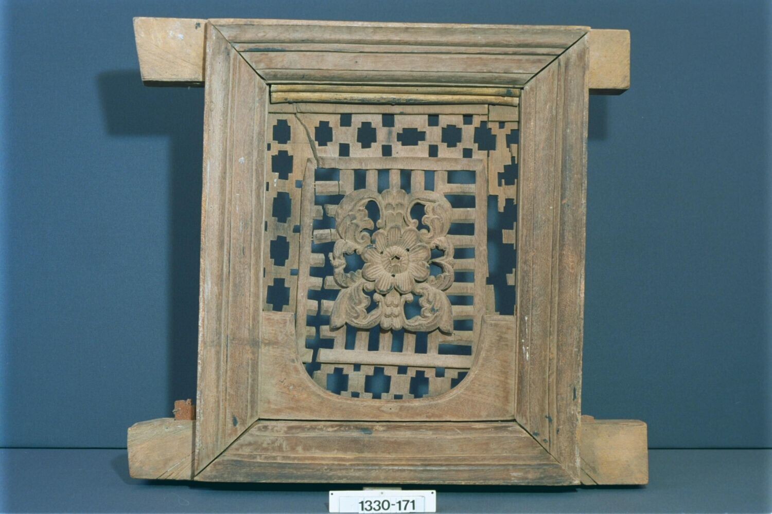 Houten schoor met een ornament van een vis-olifantenkop