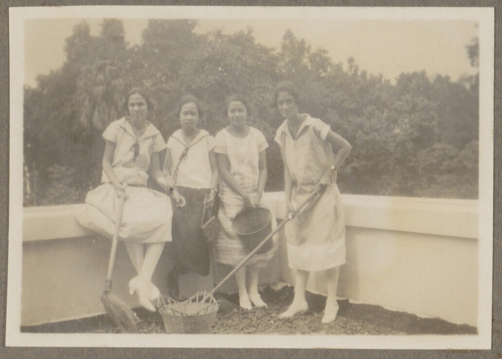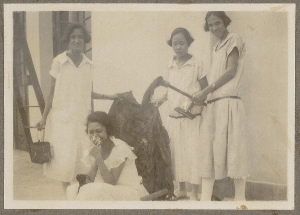 Drie Javaanse vrouwen en een man bij het drogen van ...