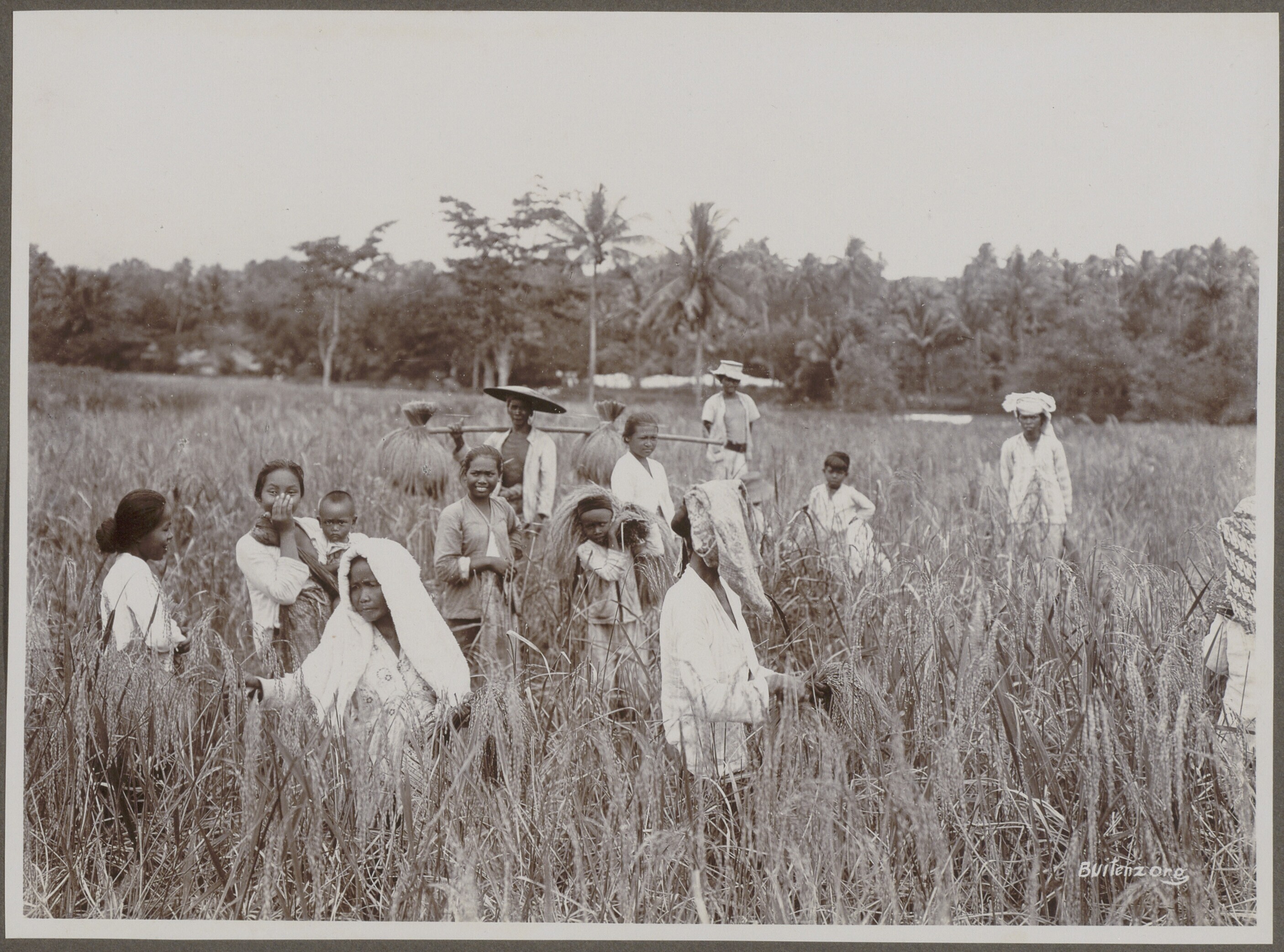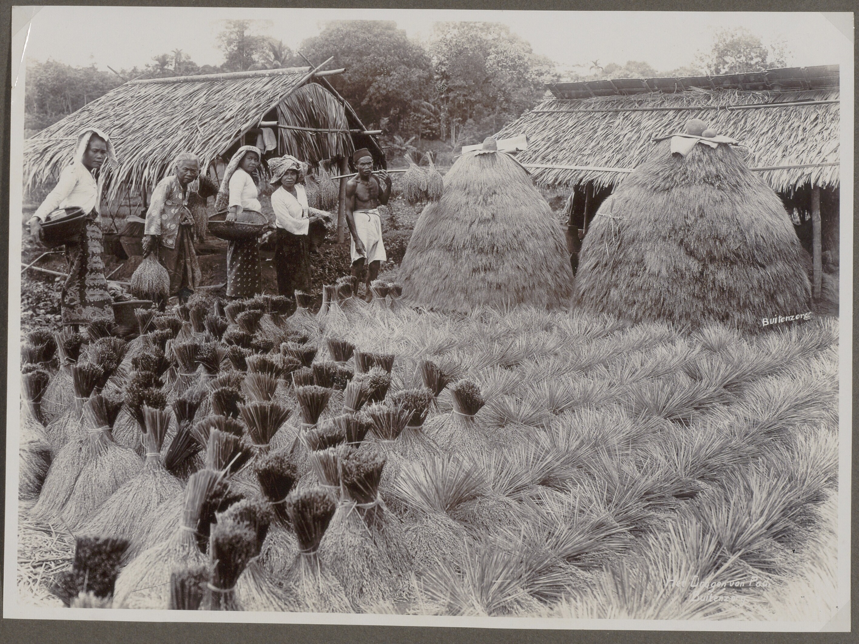 Groep Javaanse vrouwen en mannen met geoogste rijst ...