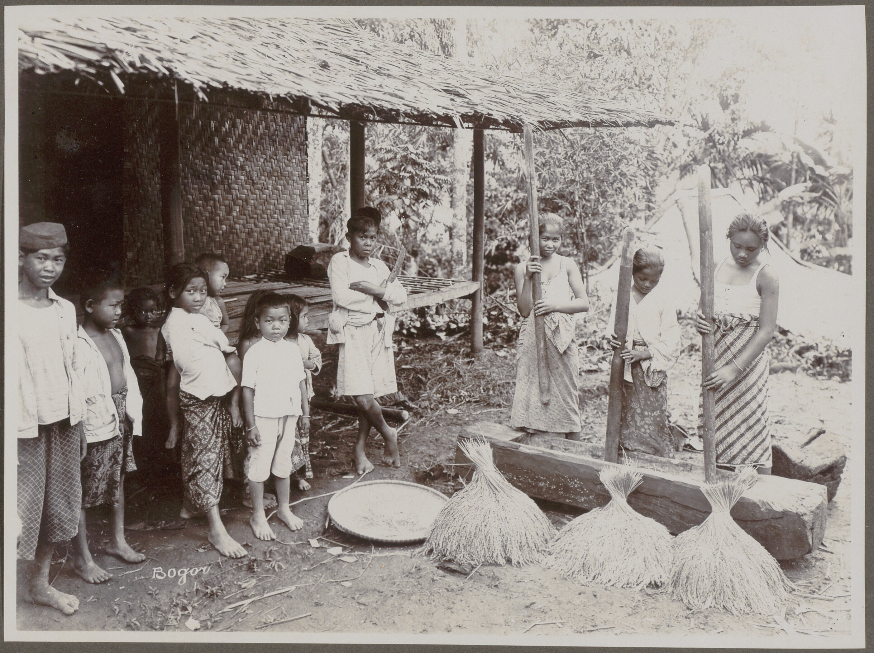 Groep Javaanse kinderen bezig met het rijststampen