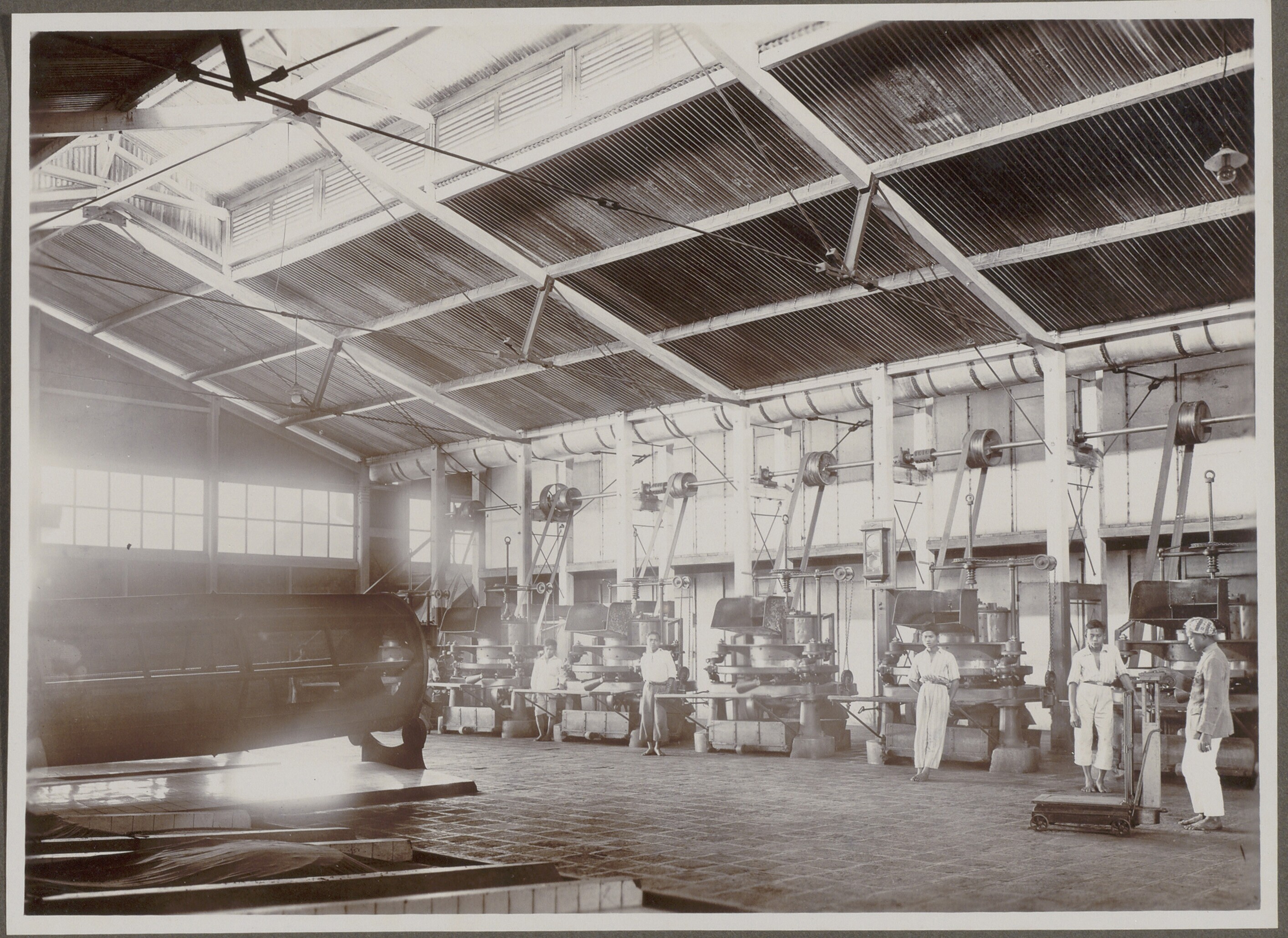 Groep Javaanse arbeiders bij fijnmaalmachines voor d...