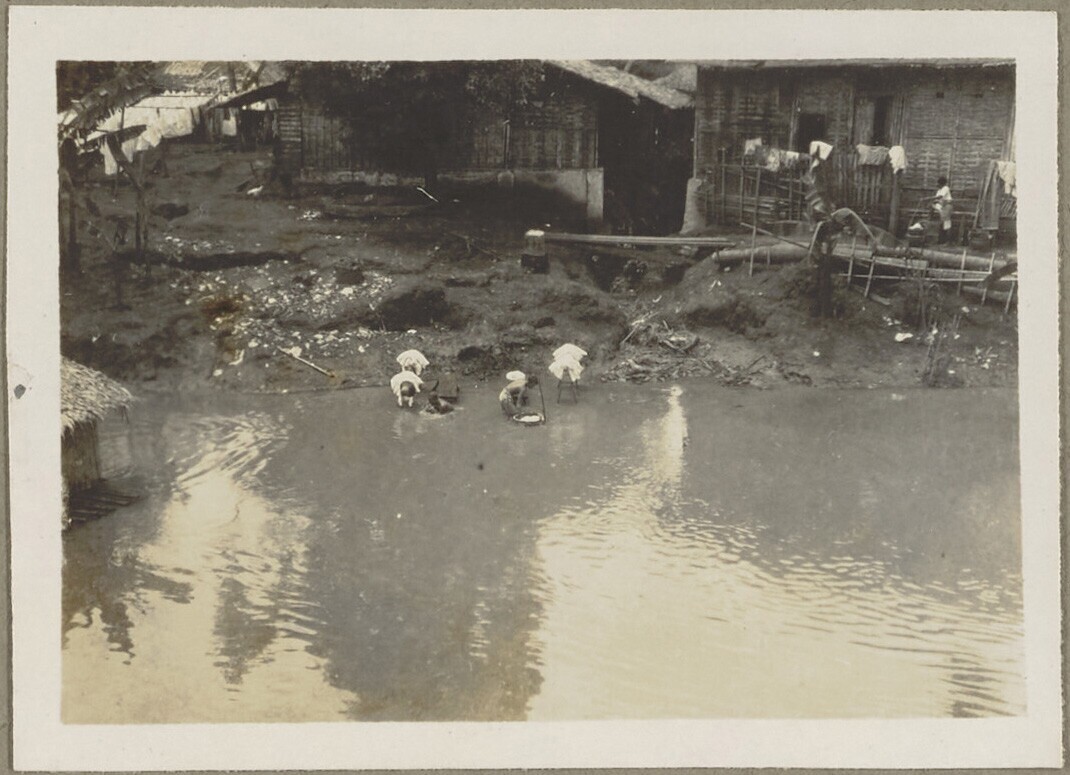Mensen vissen en wassen bij een hut op de rivier de ...