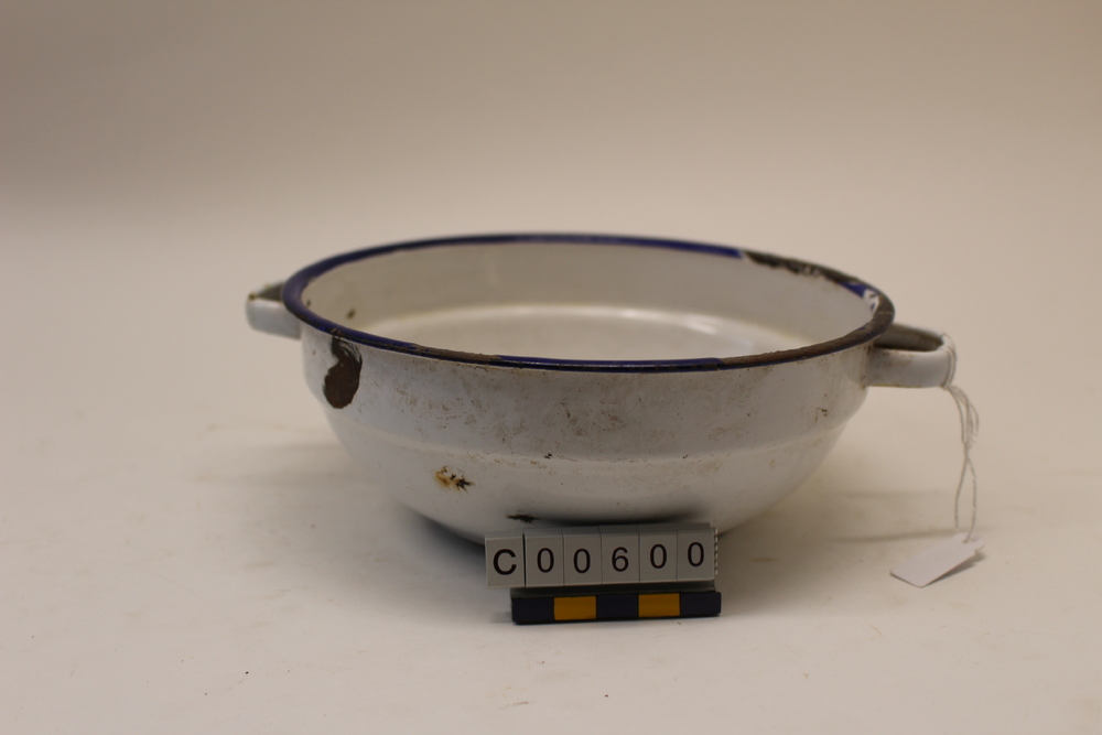 Wit emaille schaaltje met blauwe rand