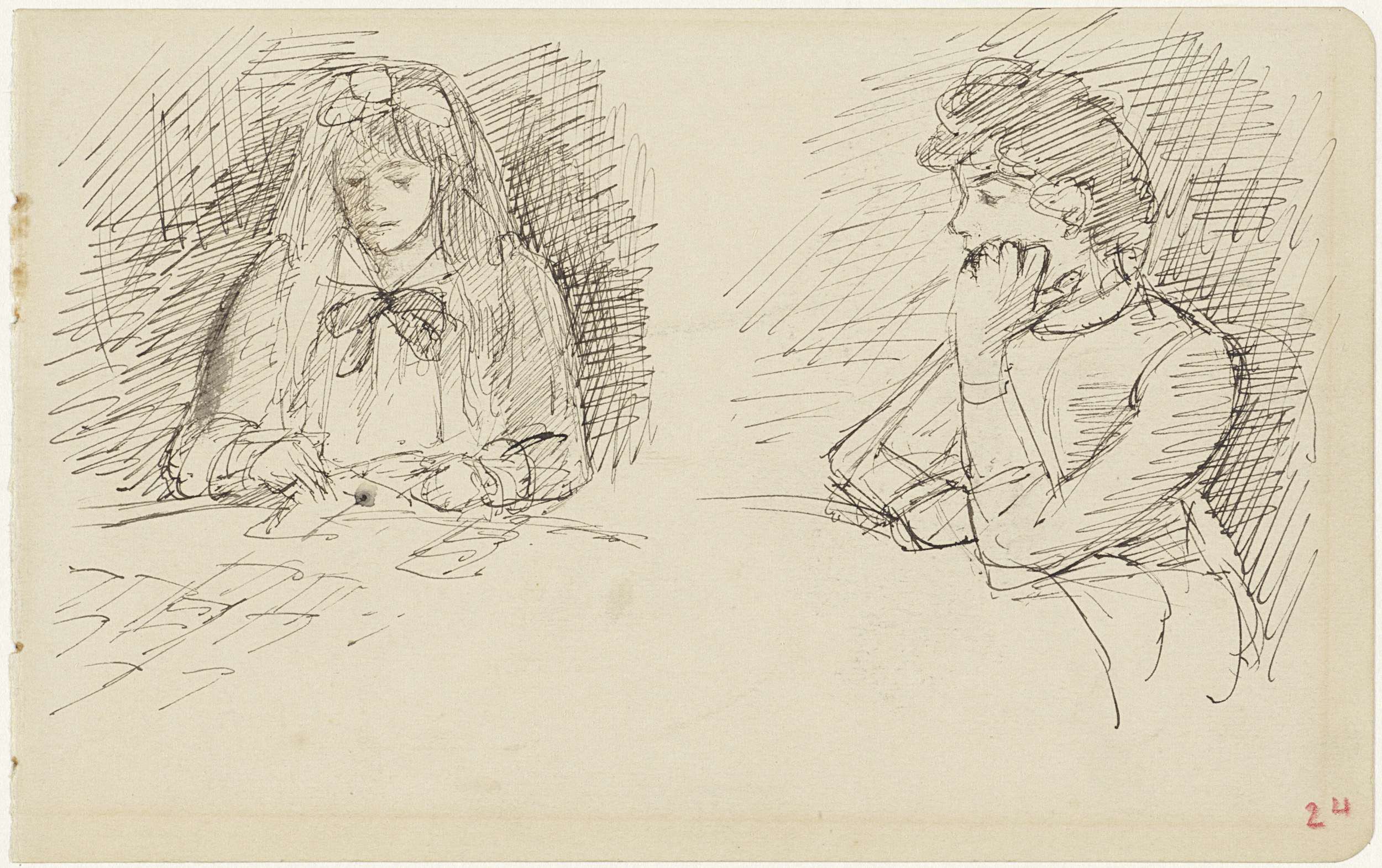 Twee studies van een vrouw zittend aan een tafel