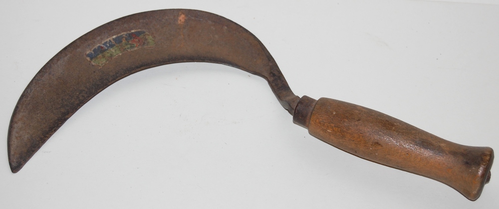 sikkel. Kort ijzeren model met houten handvat. Gemer...