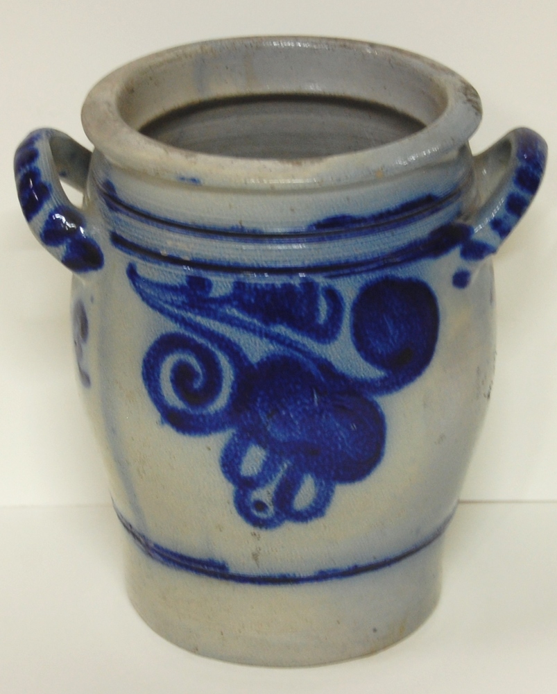 Keulse pot. Hoog cylindrisch opgebouwd met twee oren...
