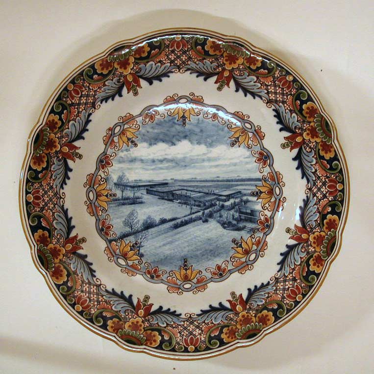 Wandbord met afbeelding fabriek, geschonken door per...
