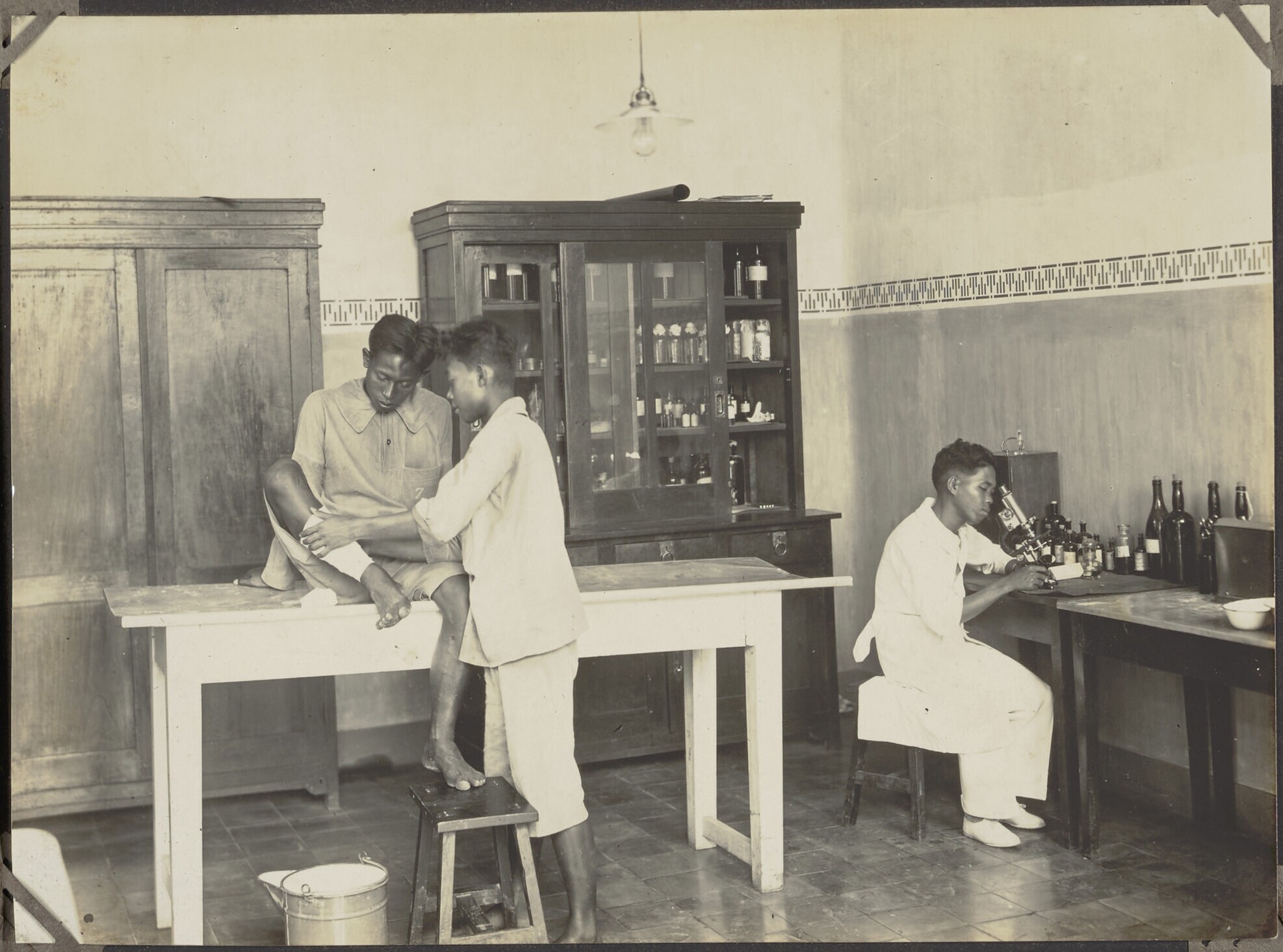 Overzichtfoto van de dokterskamer met drie jongens d...