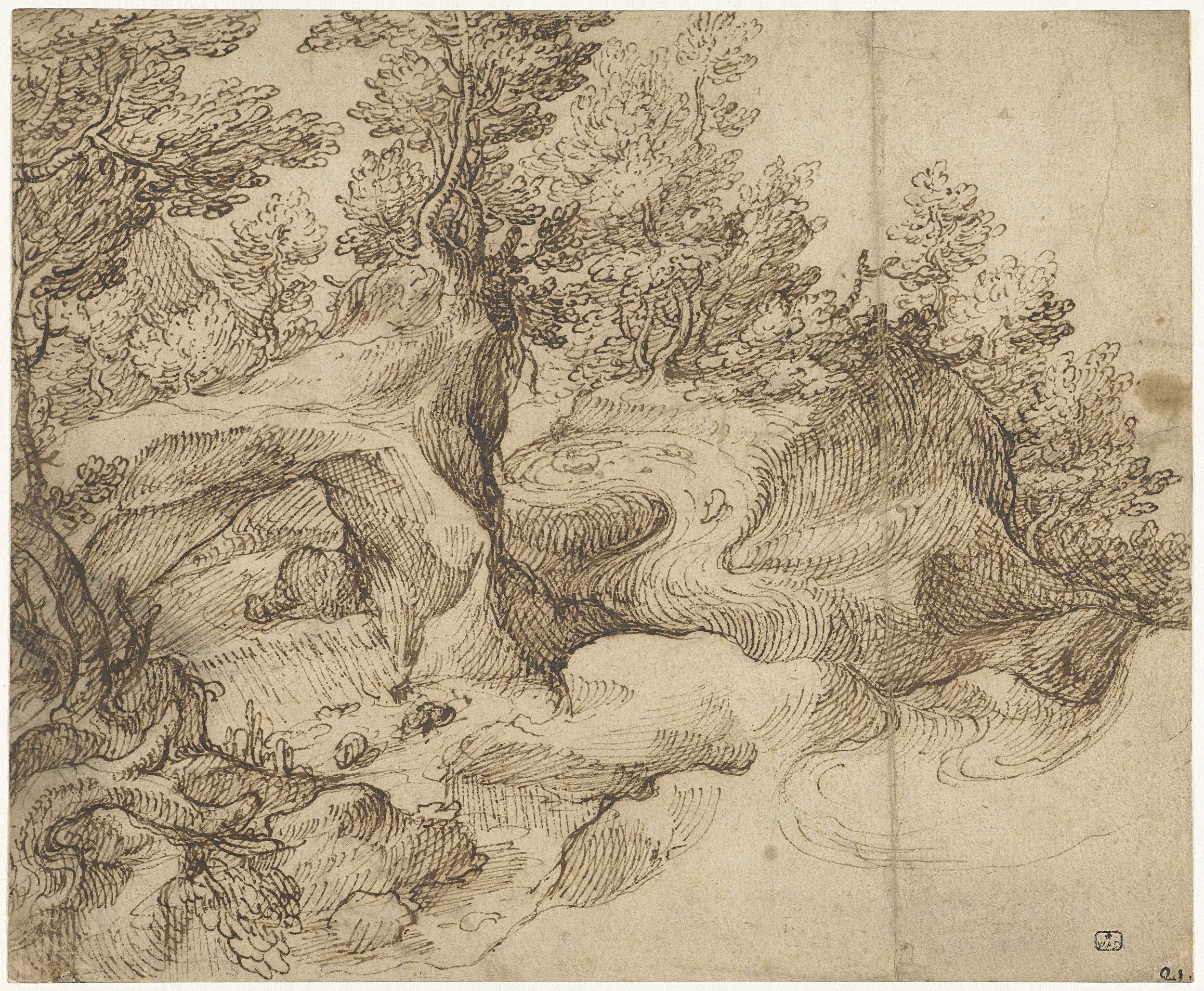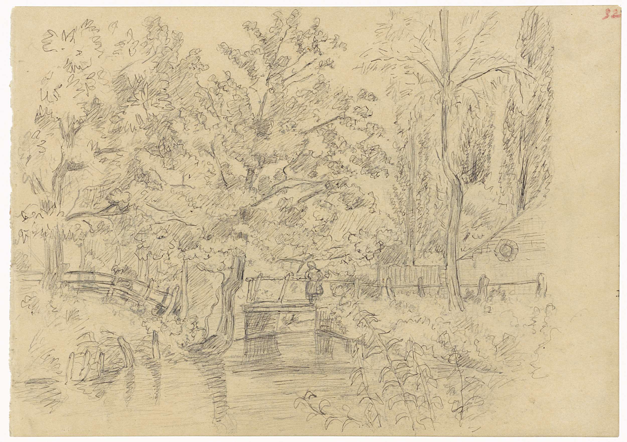 Beek met bruggetje tussen bomen