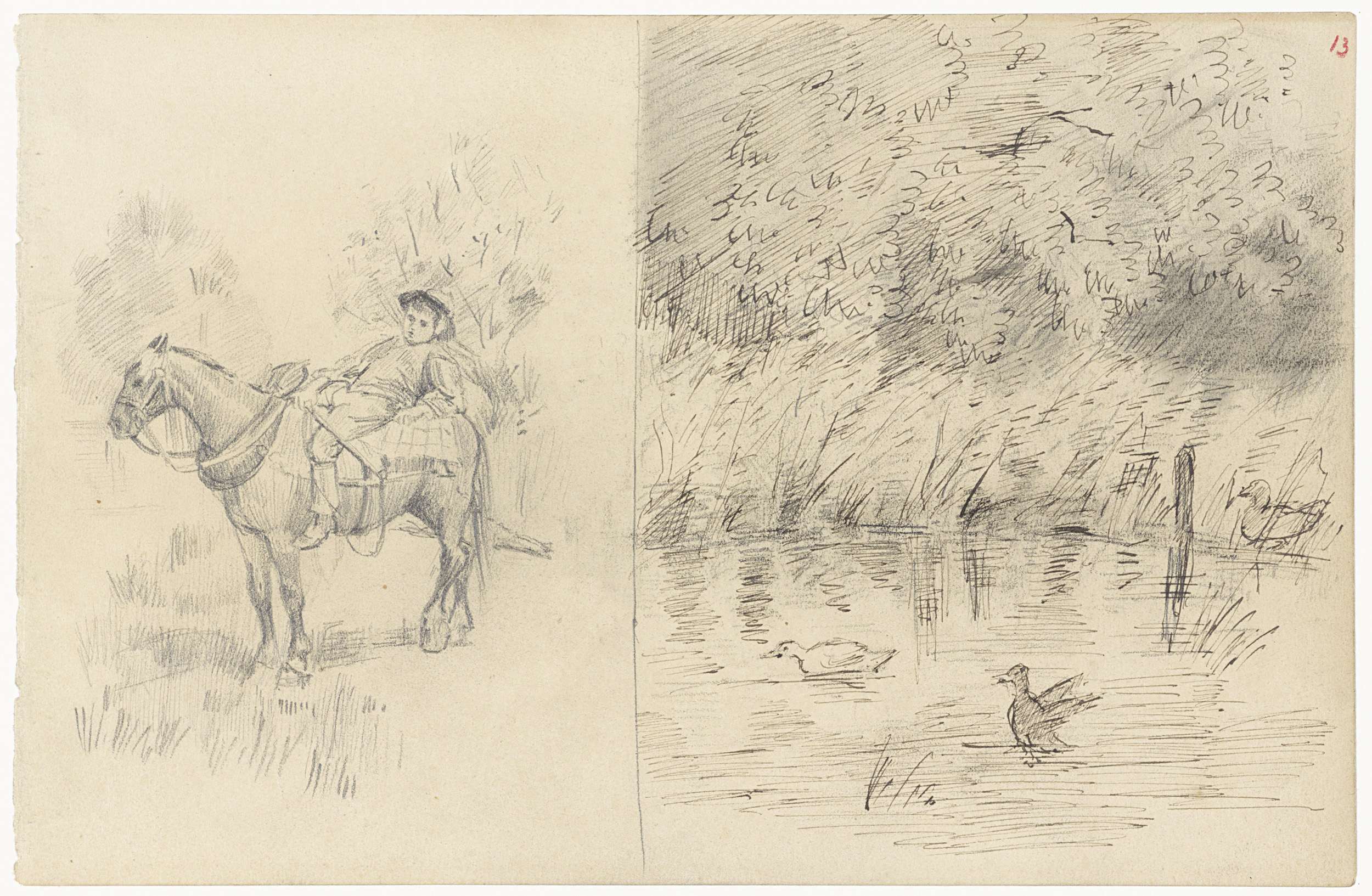 Jongetje op een paard en waterkant met drie eenden