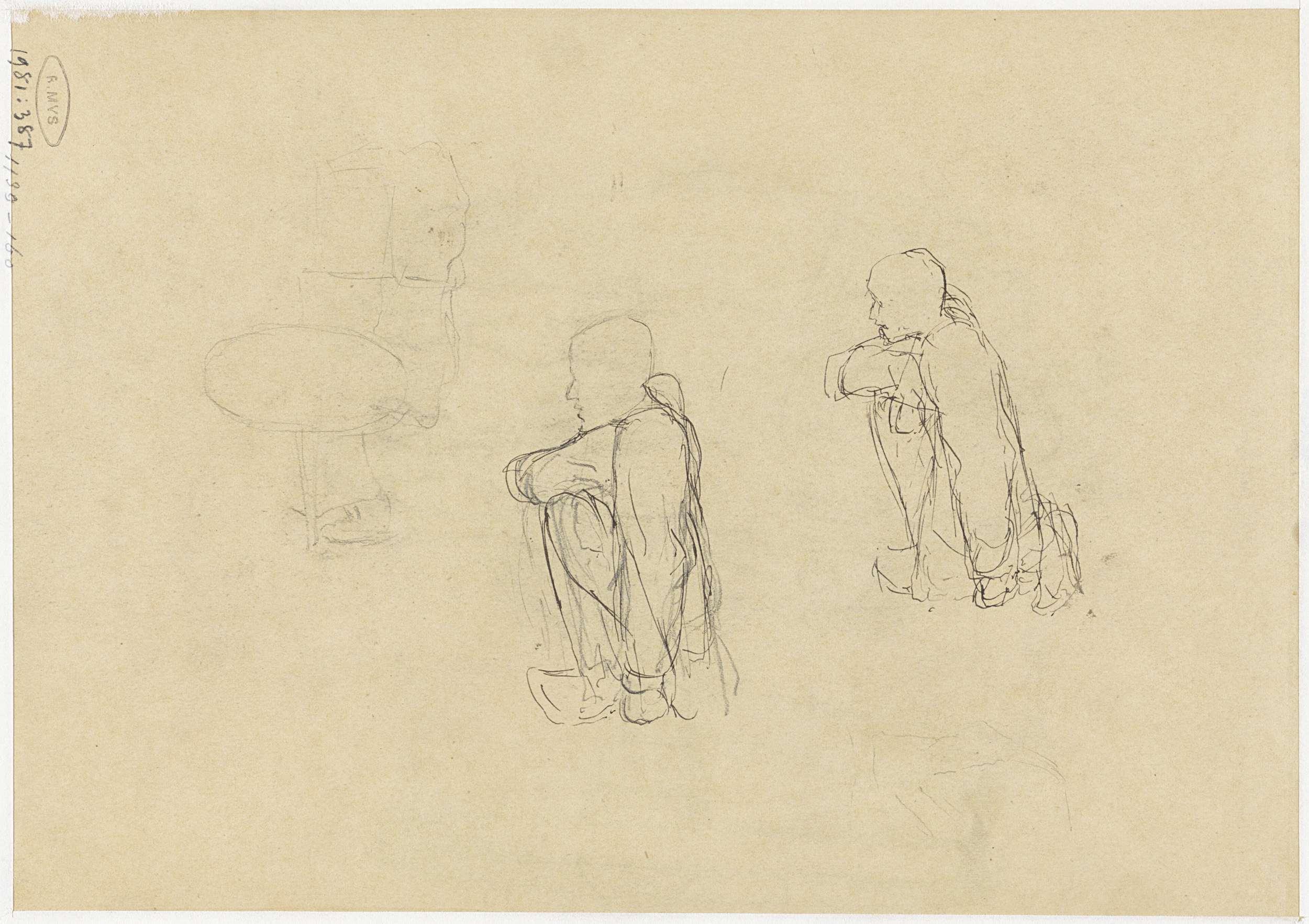 Twee schetsen van een hurkend figuur