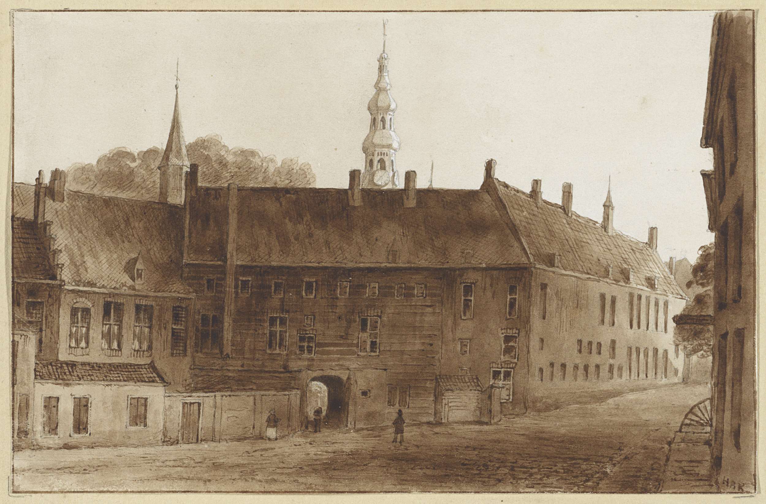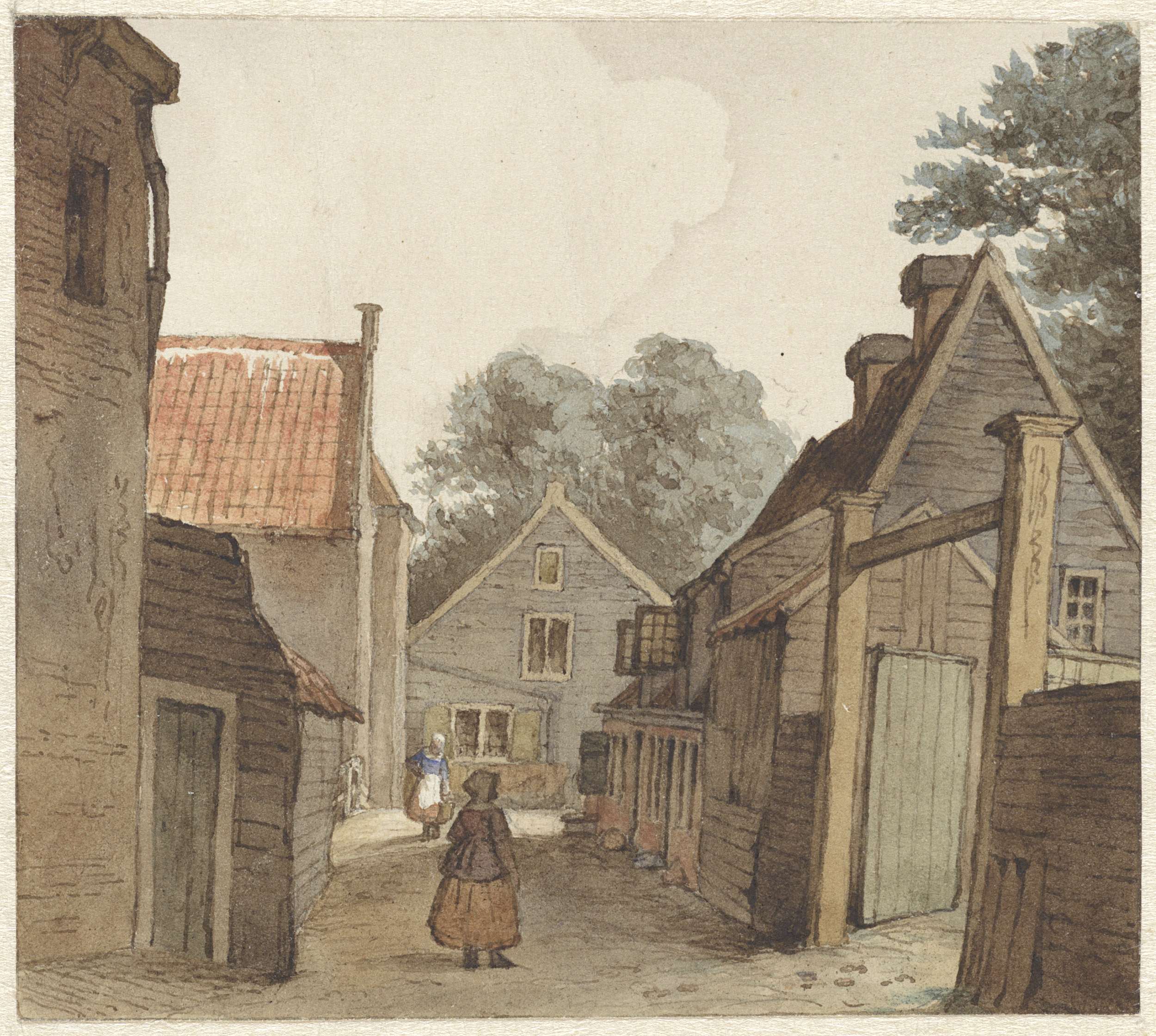 Dorpsgezicht met links twee mannen leunend tegen een...