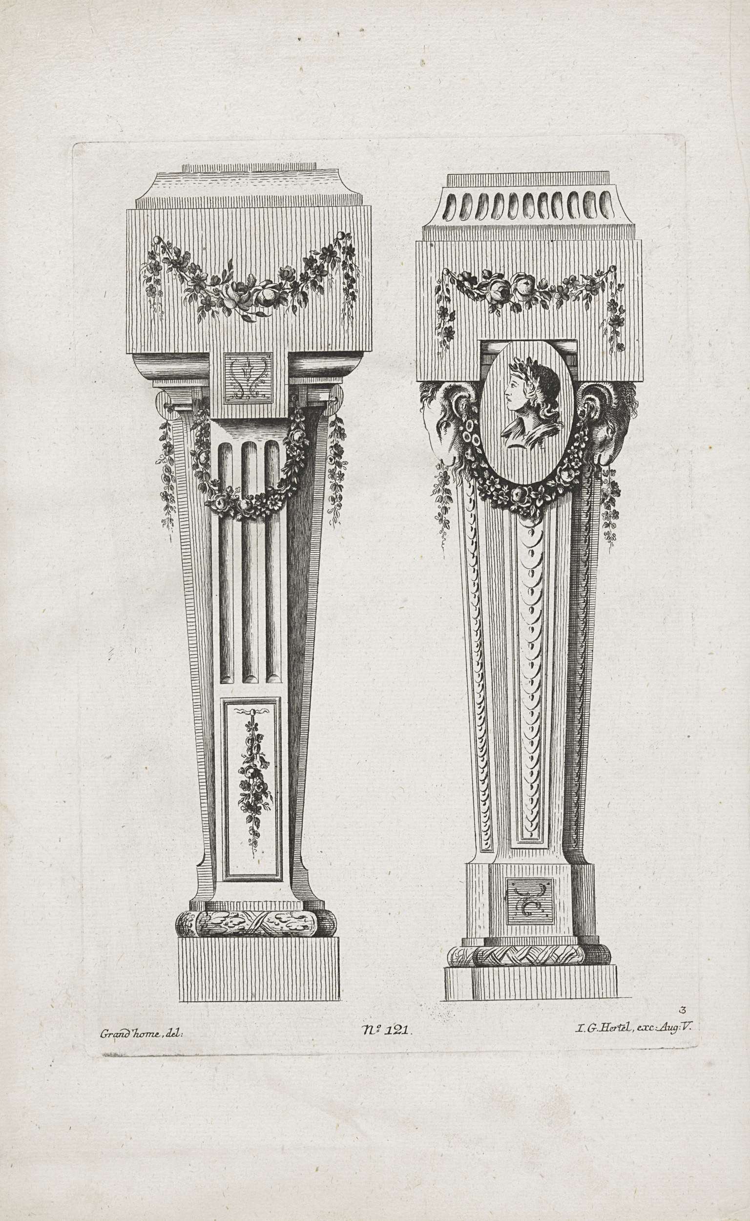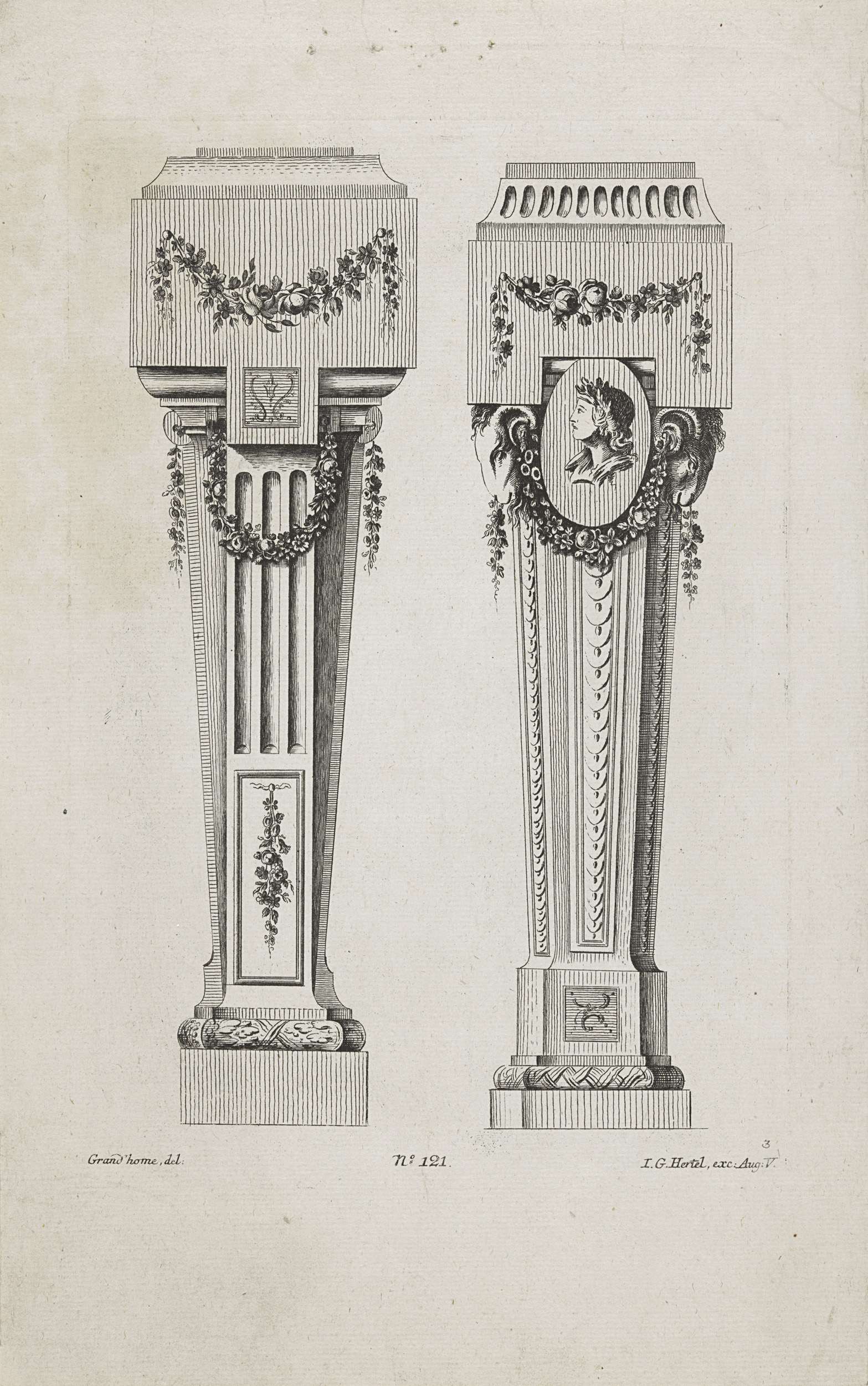 Twee voetstukken met lauwerkrans en medaillon