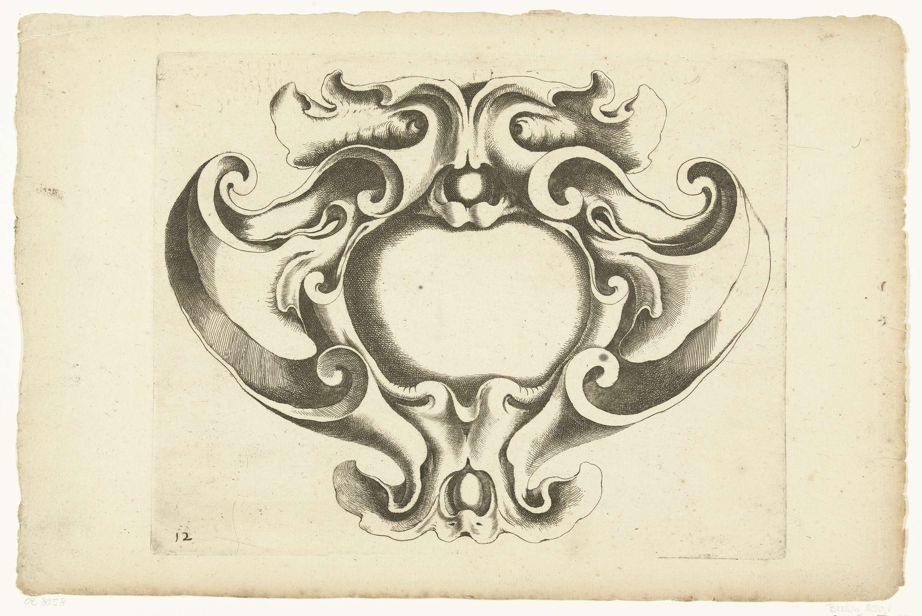 Cartouche met onderaan en bovenaan een masker