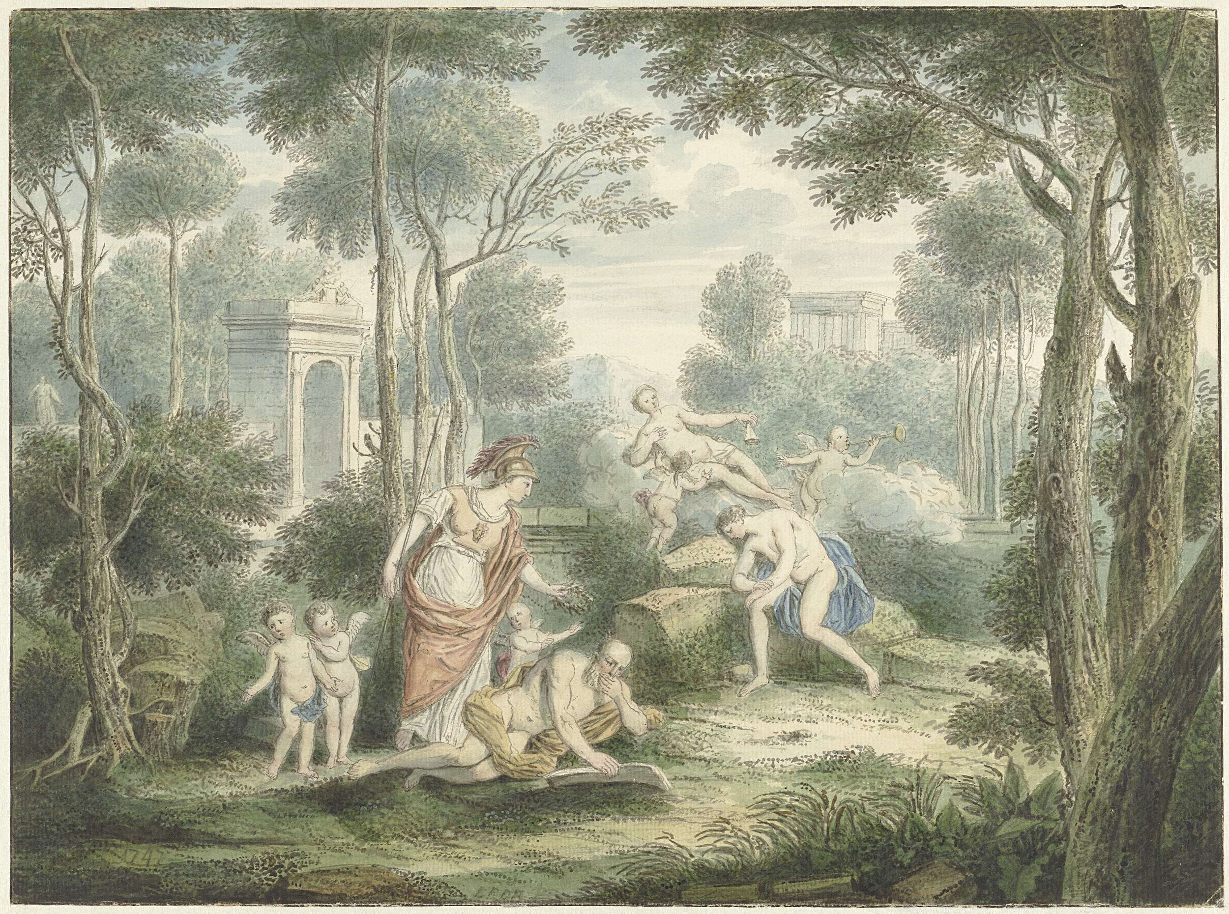 Allegorische cartouche met Prudentia, Minerva en ero...