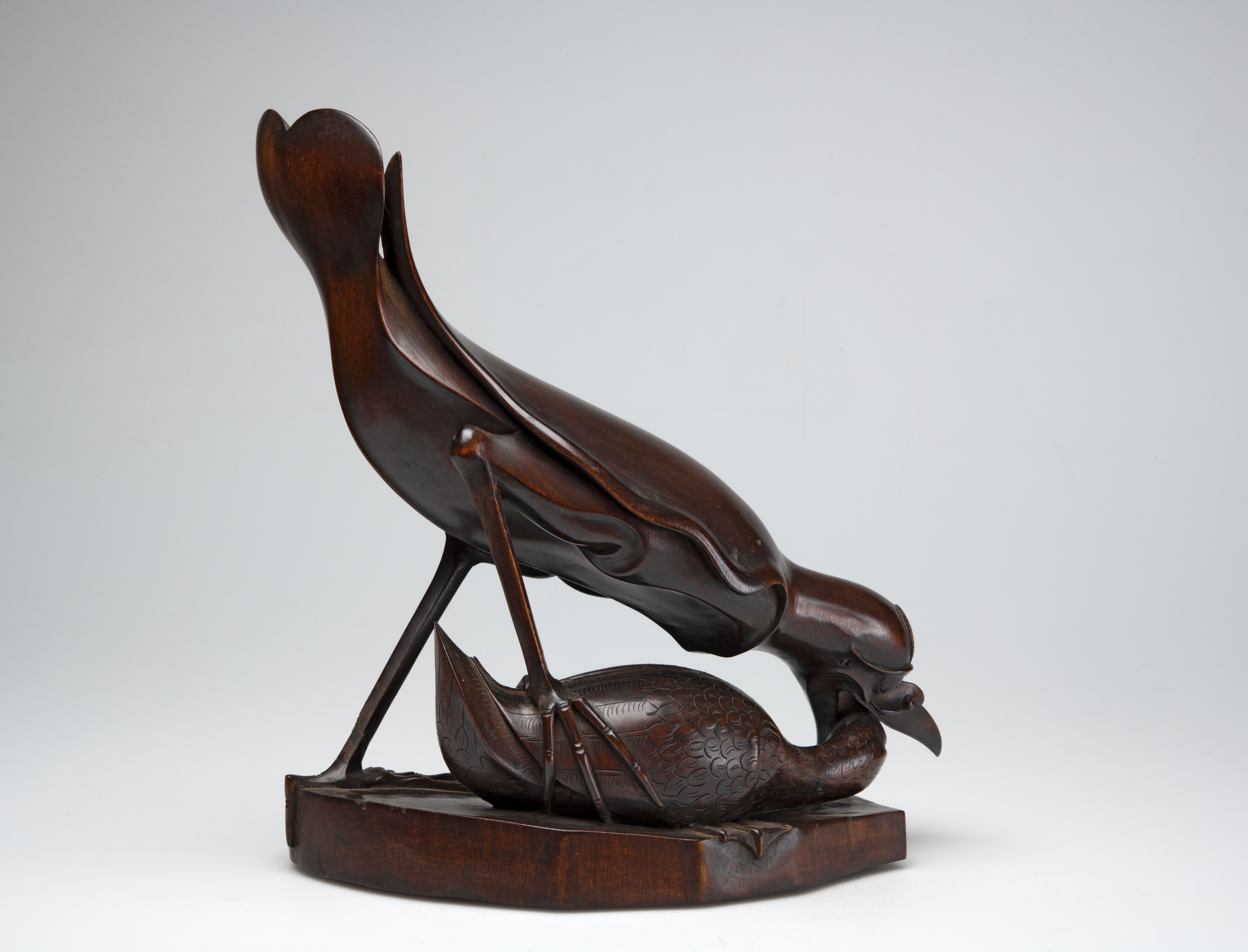 Houten beeld van een reiger met een eend