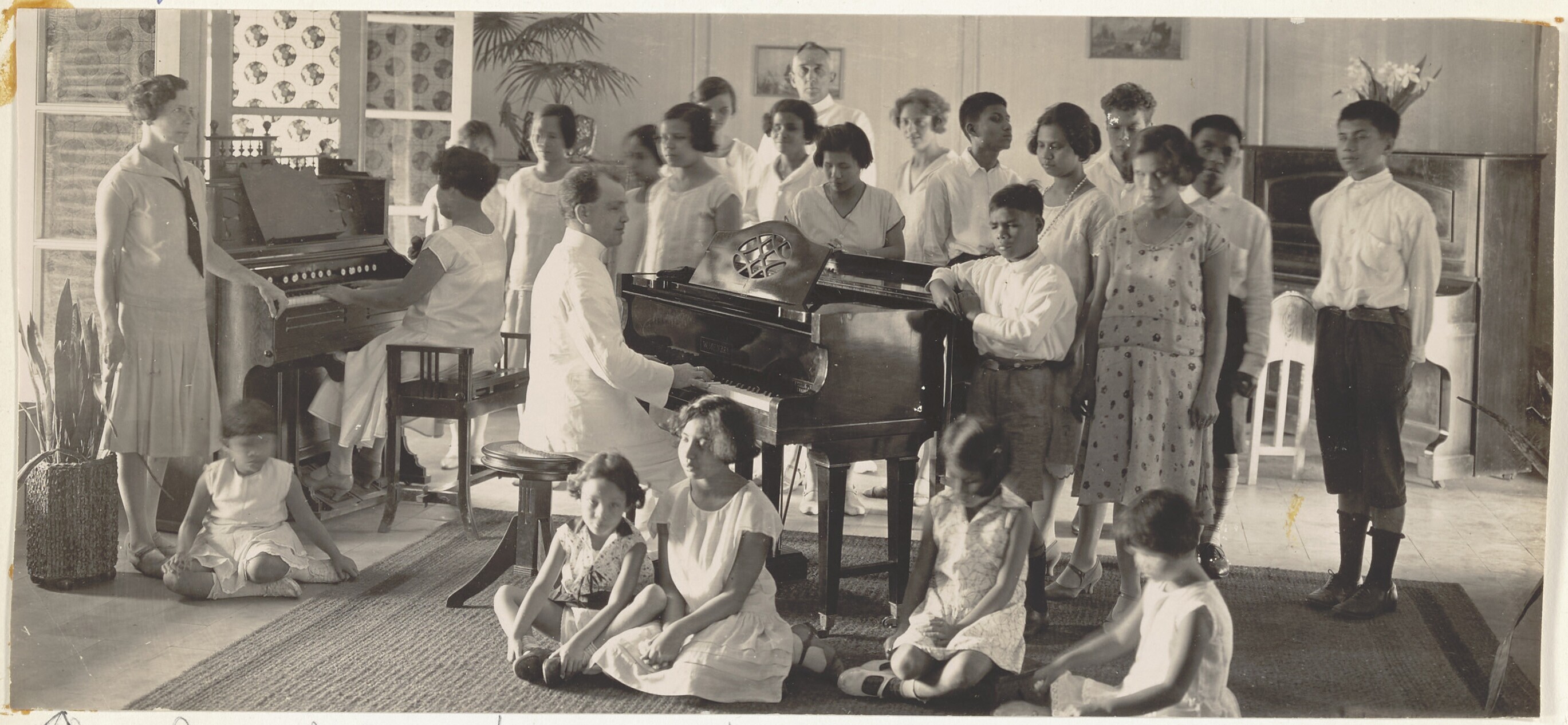 Portret van een groep bij een orgel en piano