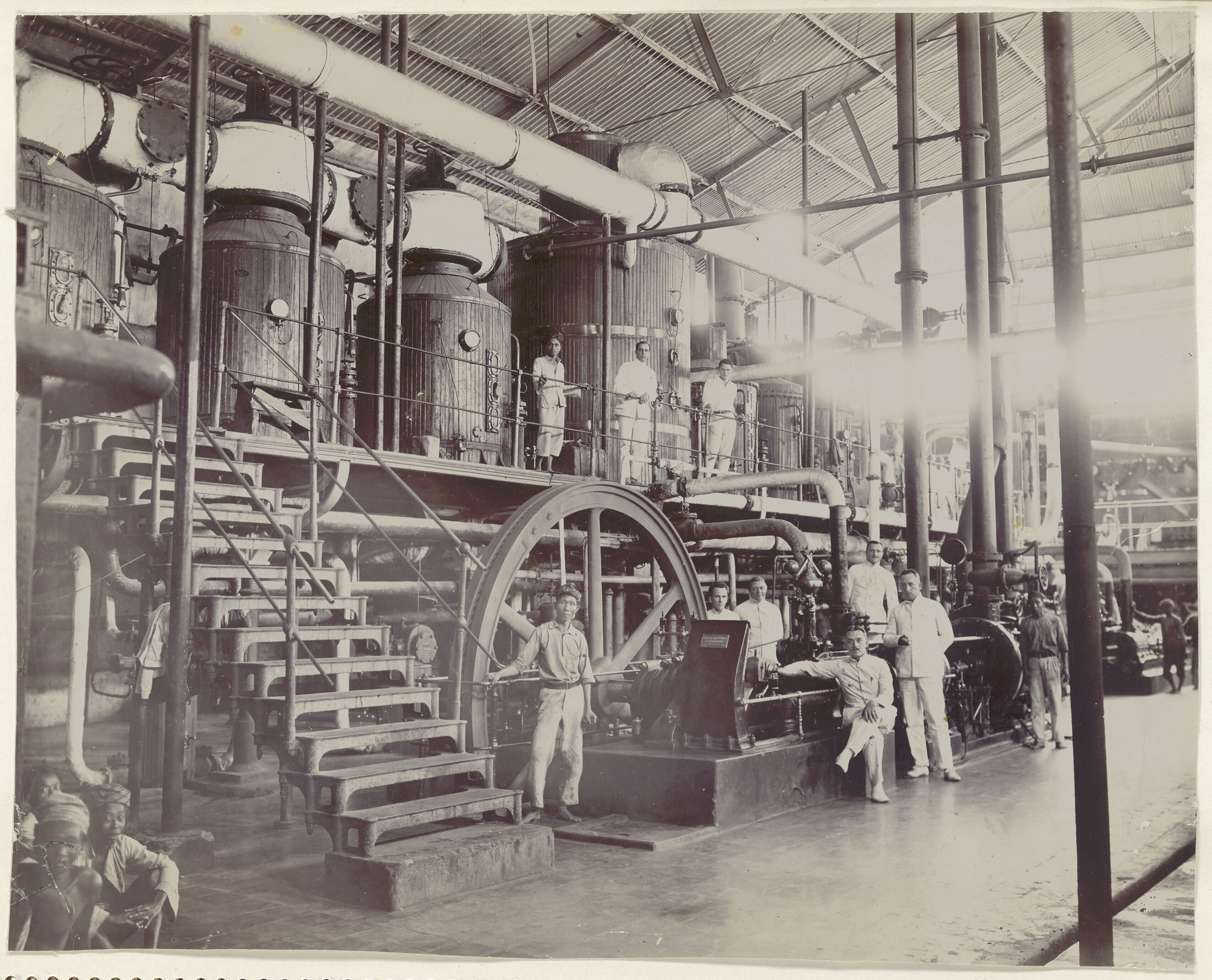 Portret van een groep in machinekamer van suikerfabr...