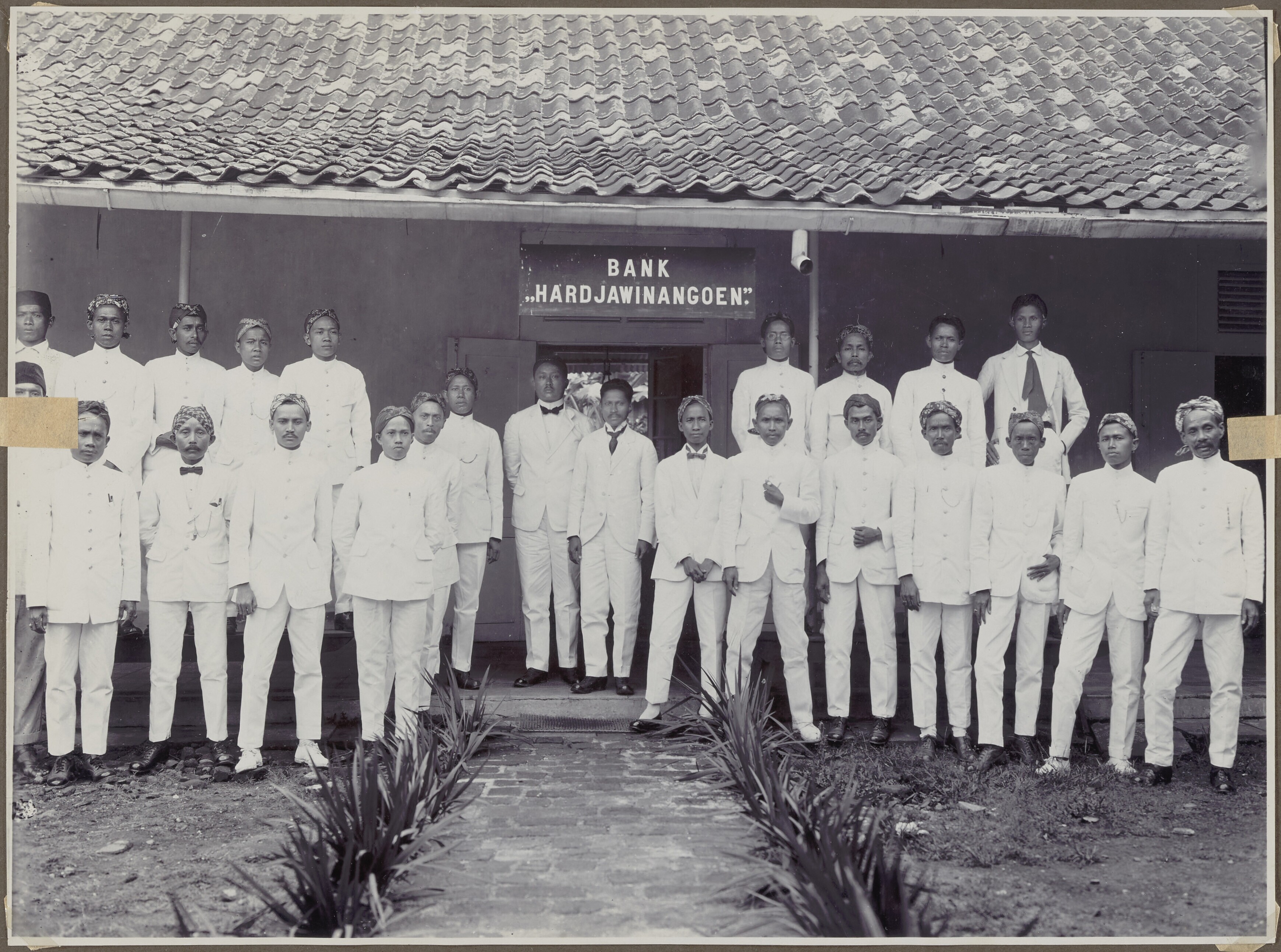 Groepsportret van personeel van een bank in Sérang