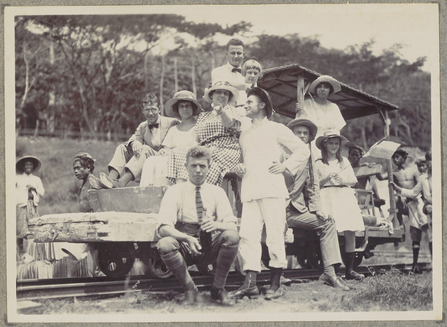 Portret van een groep op een lorrie