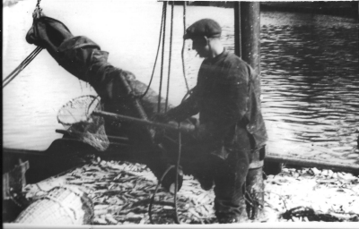 Klaas Blokker in een schouw vol haring, afkomstig va...