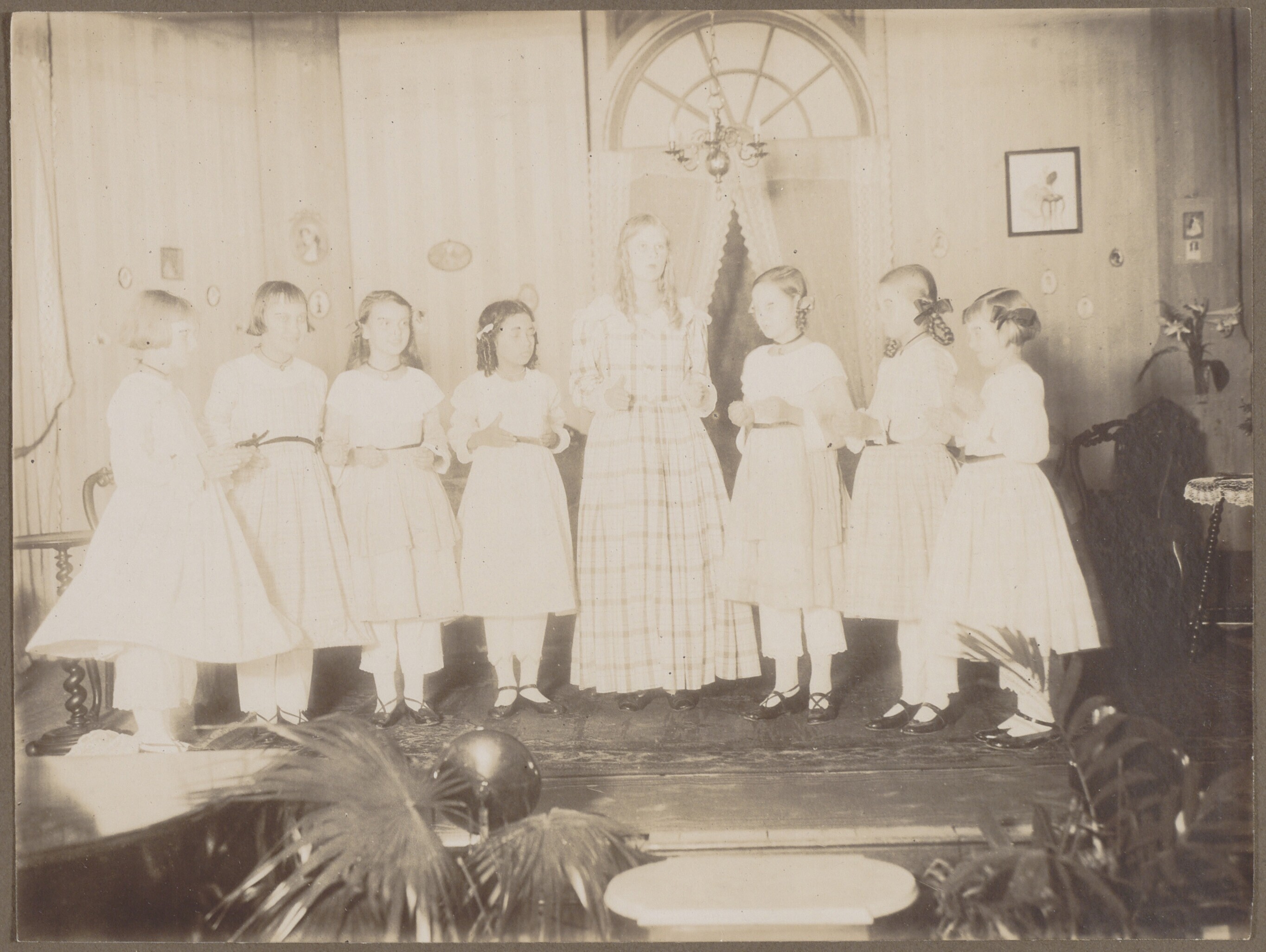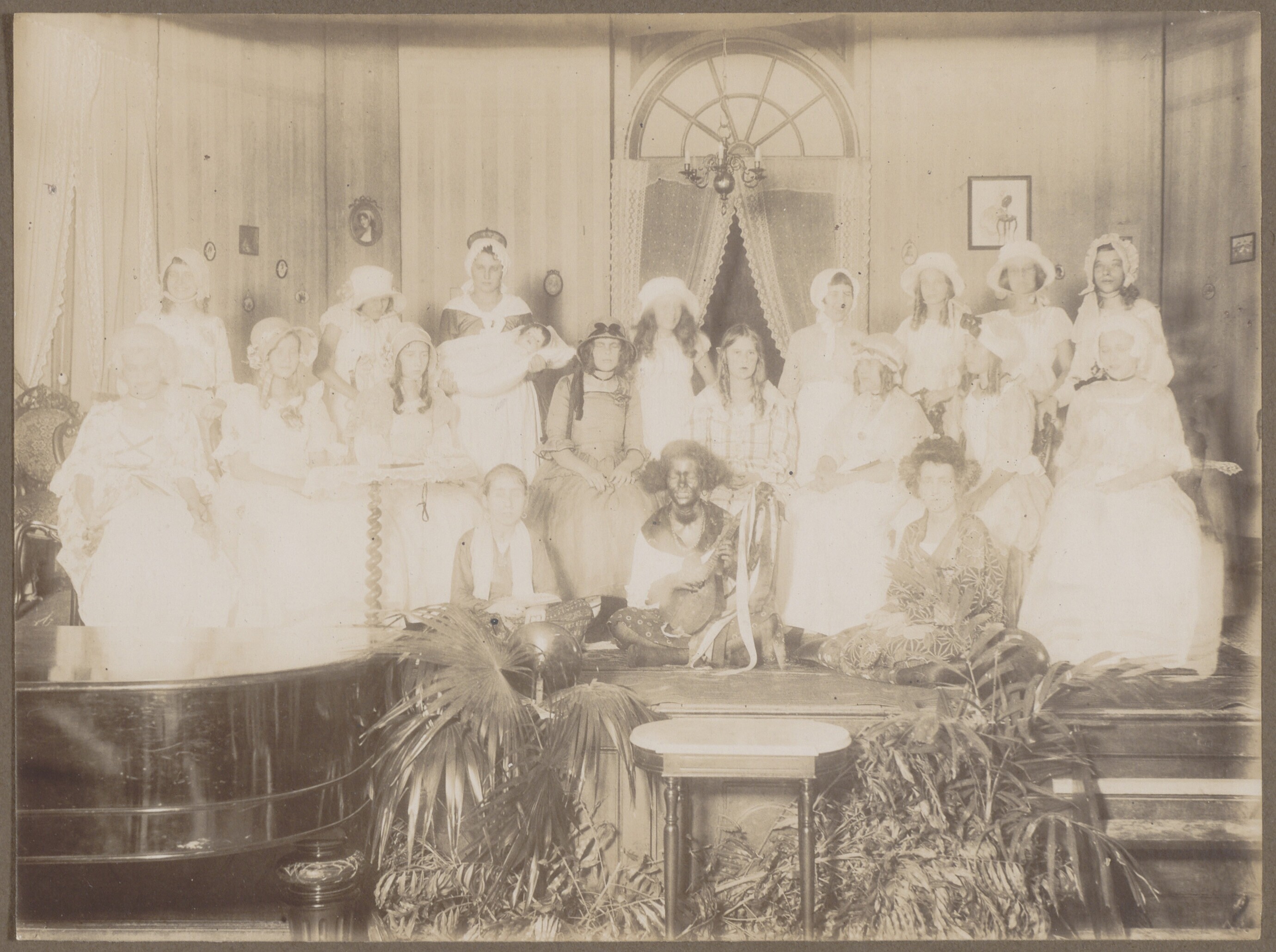 Groepsportret van vrouwlijke toneelspelers op het po...