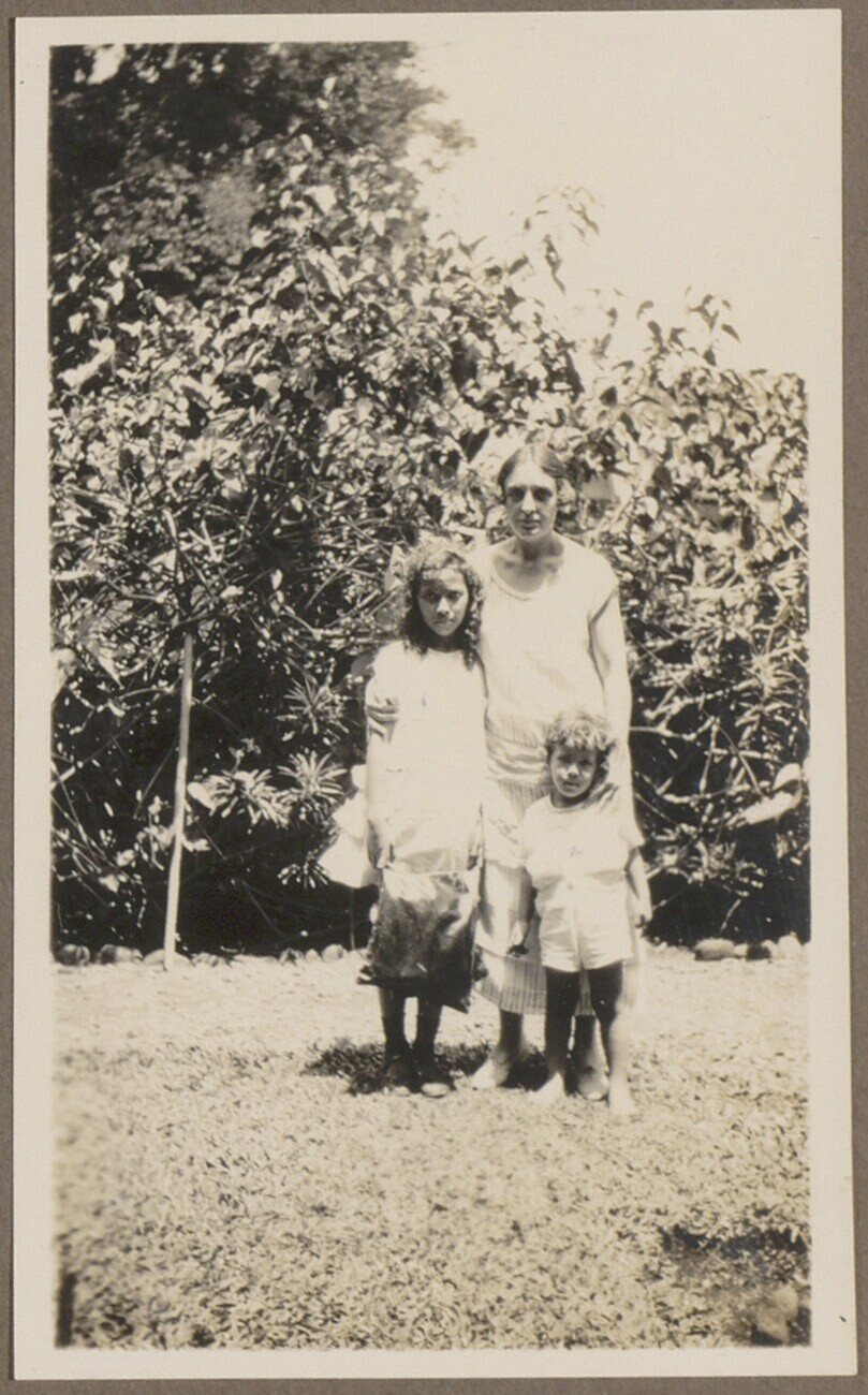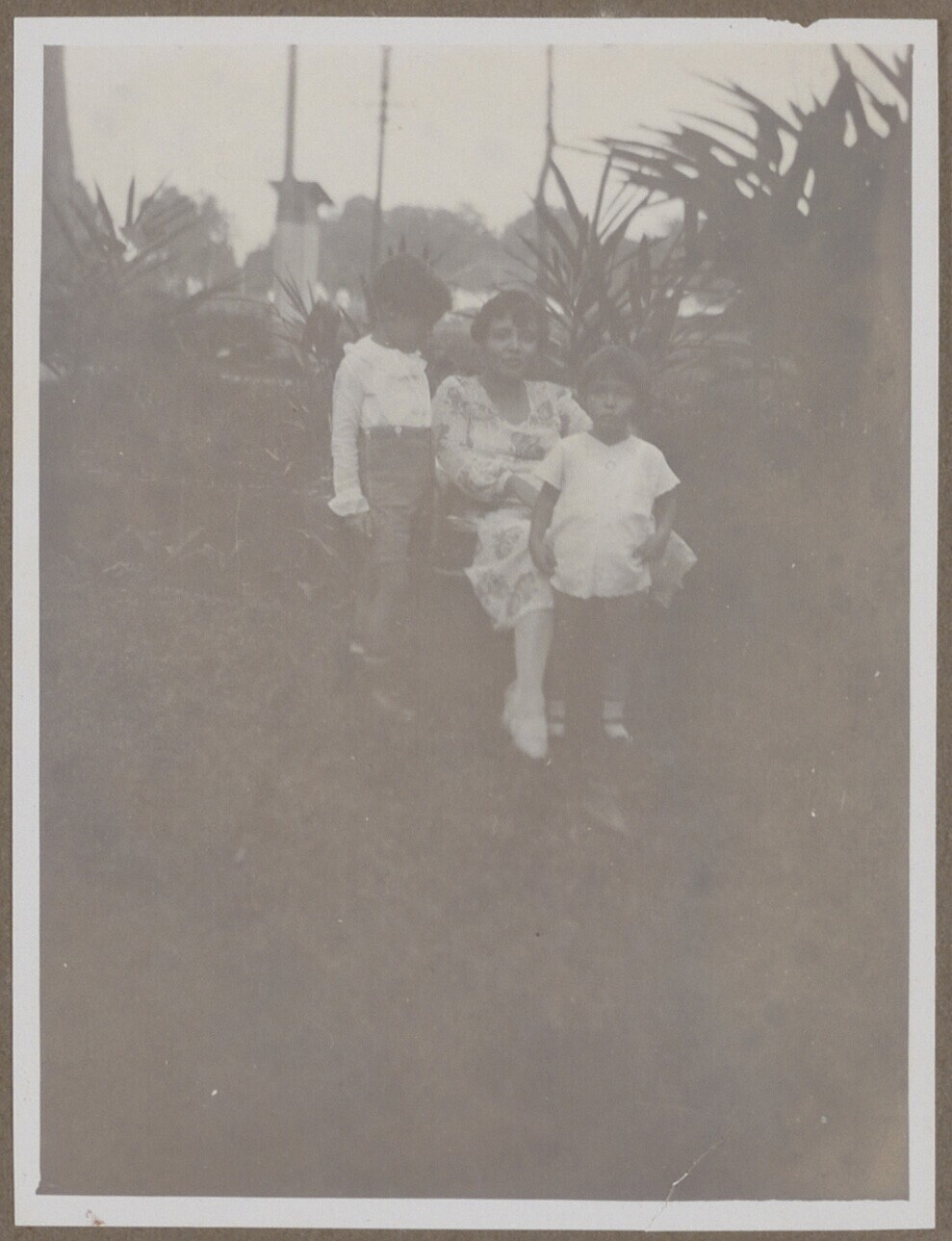 Vrouw en twee kinderen in de tuin