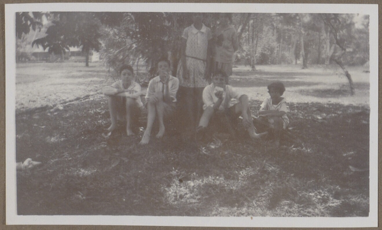 Zes kinderen in de schaduw van een boom