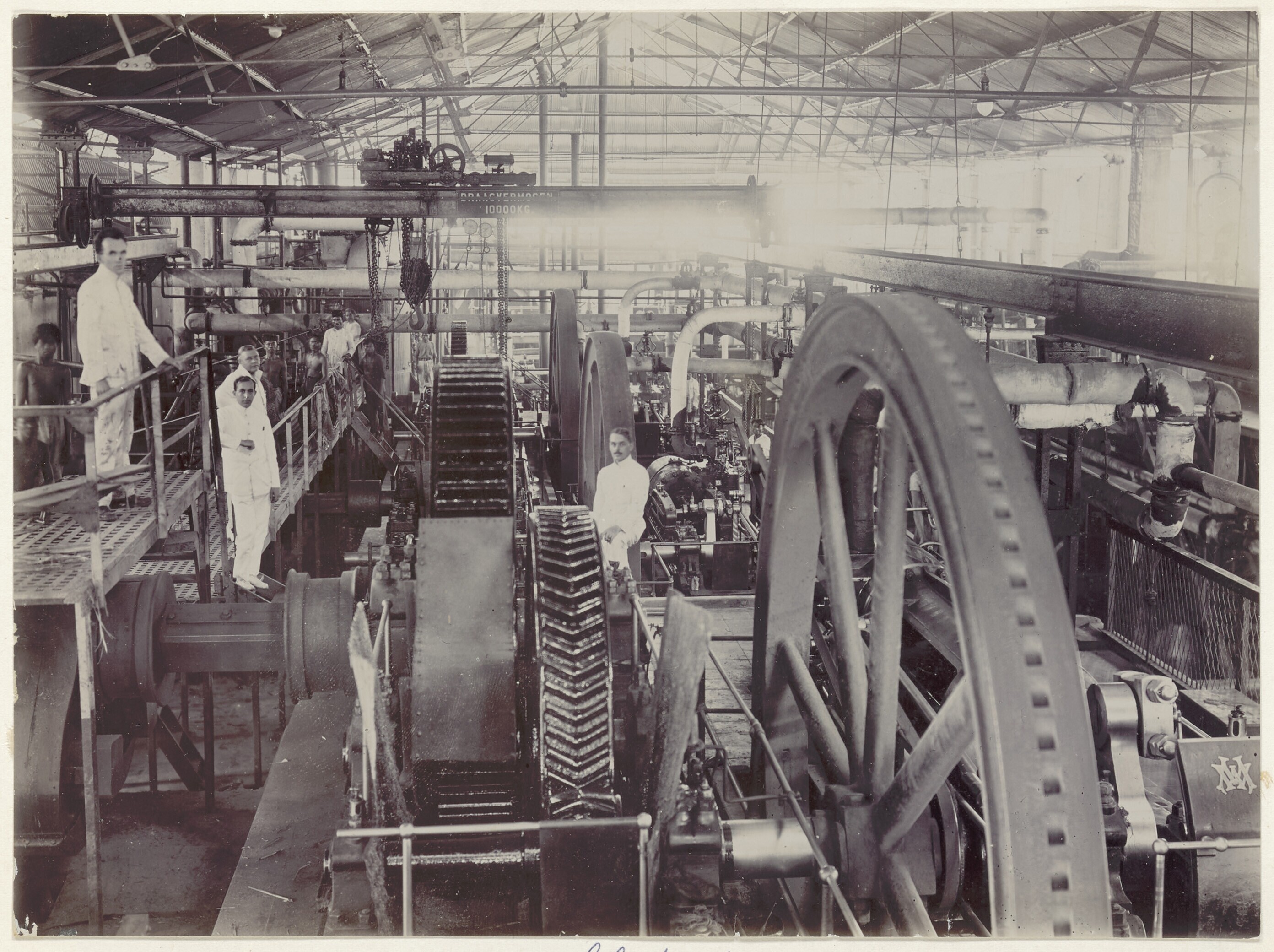 Uitzicht op machinekamer van suikerfabriek Bagoe