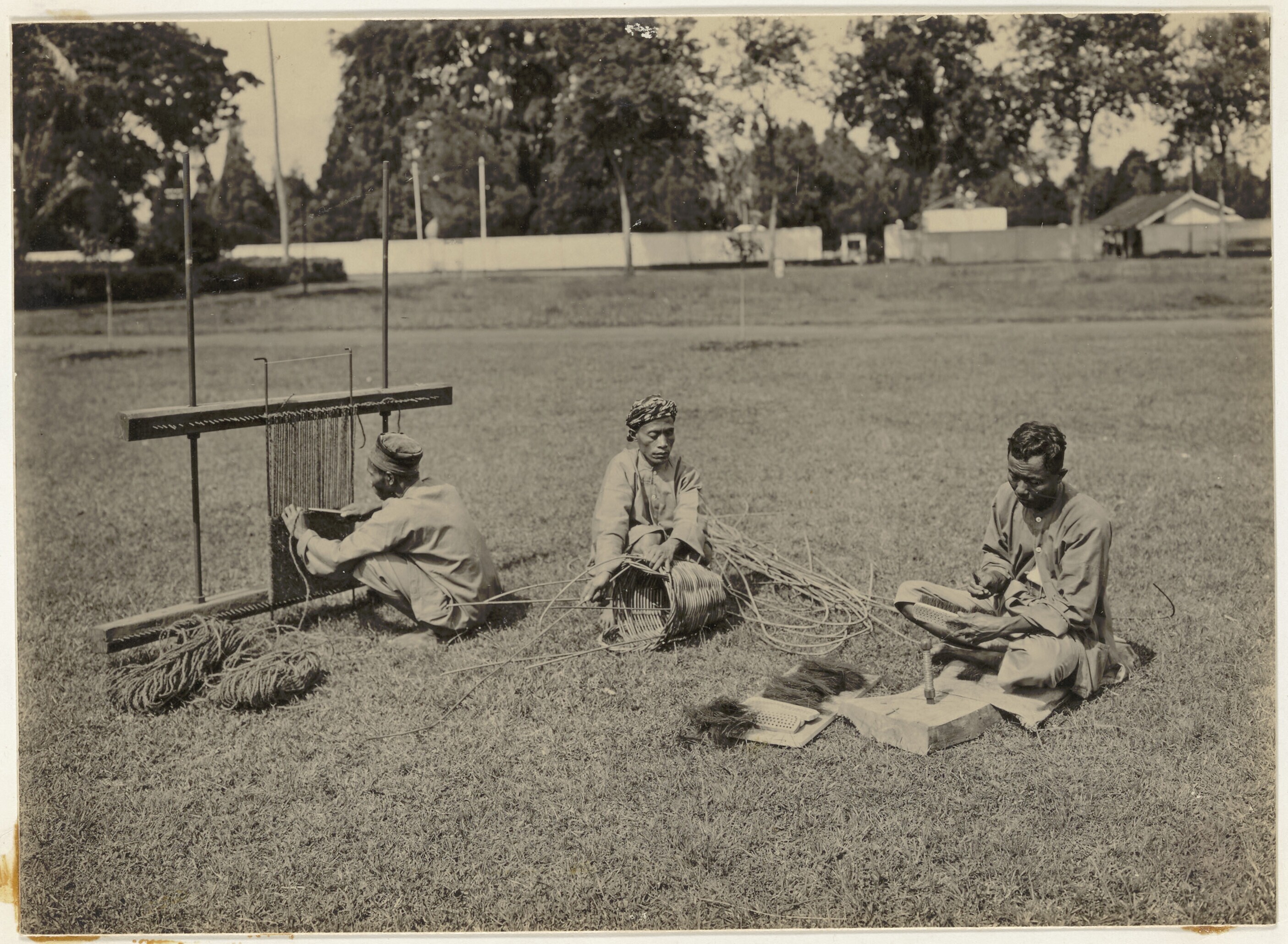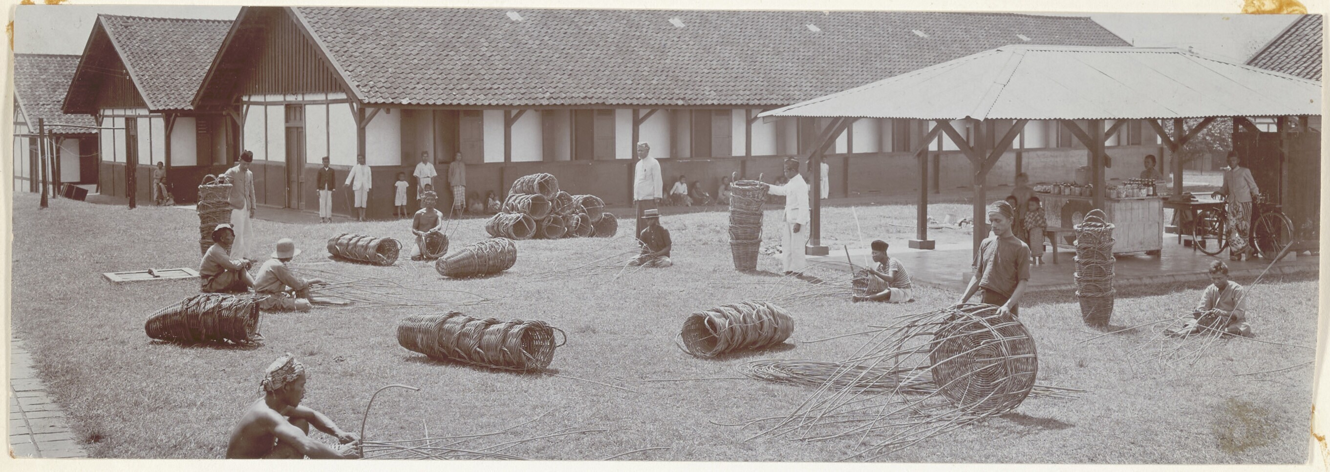 Uitzicht op mandenmakerij buiten op het erf van het ...