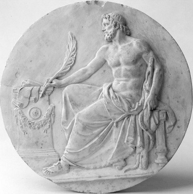 Sokkel van cartouche met weesmeisje en oude man op d...