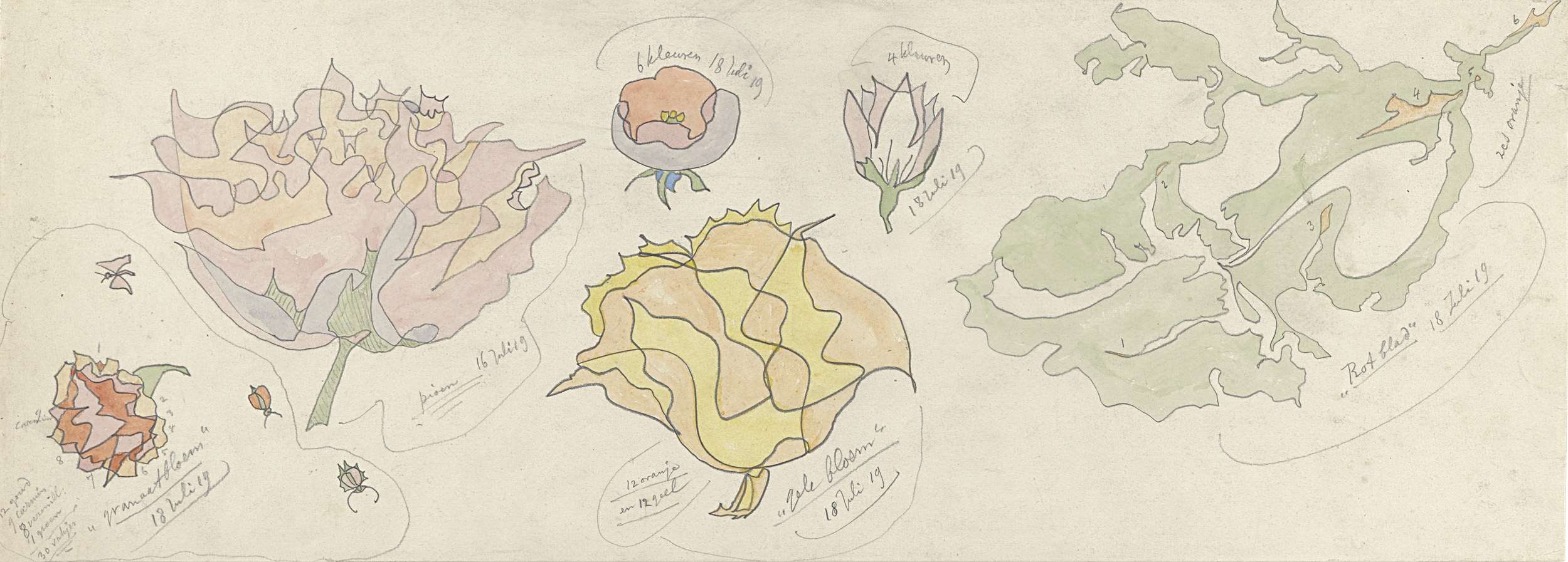 Ontwerpen voor aardewerkdecoratie: zes tulpen en and...