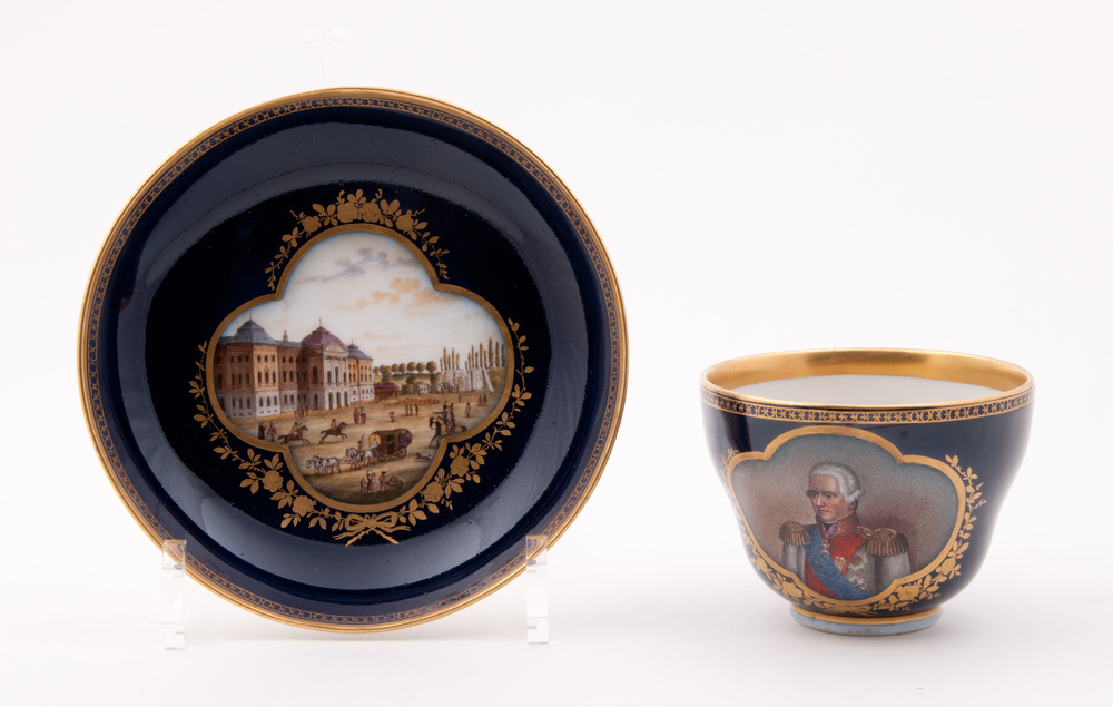 Kop en schotel van porselein, vervaardigd door Meiss...