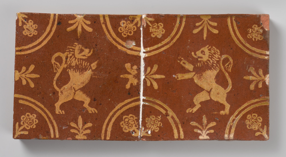tegelveld van twee tegels van aardewerk in inleg-tec...