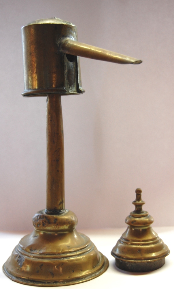 snotneuslamp van messing met voet en lange smalle sc...