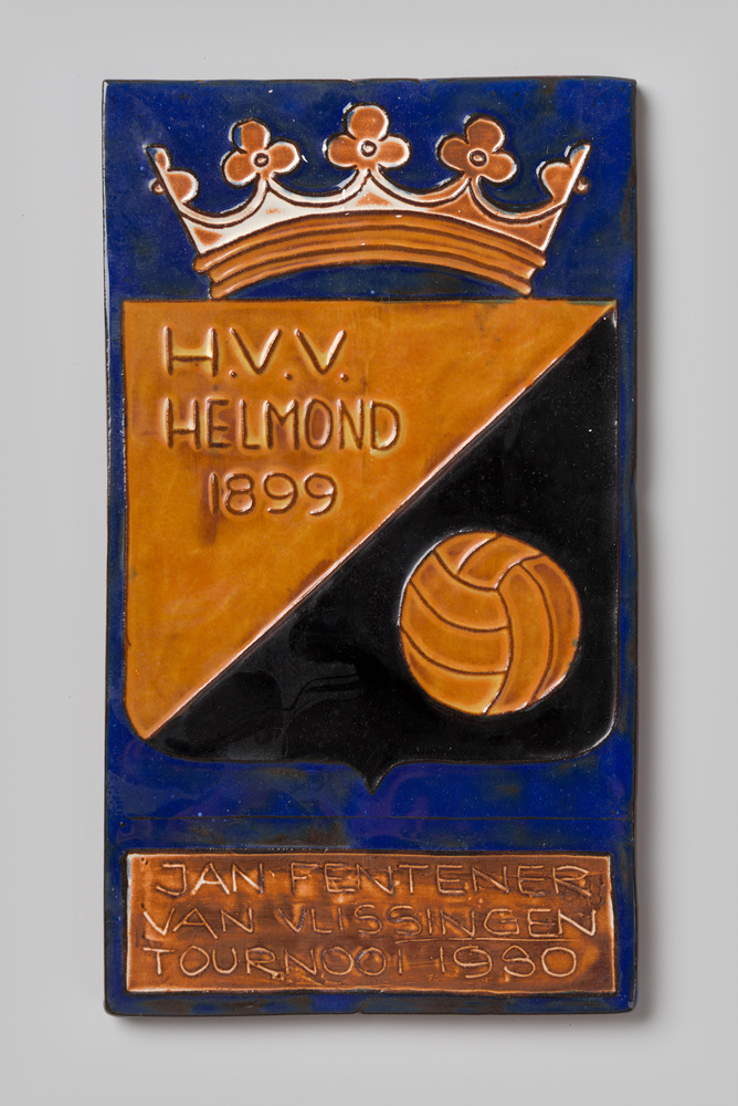 kunststof gedenkschild op houten paneel met het wape...