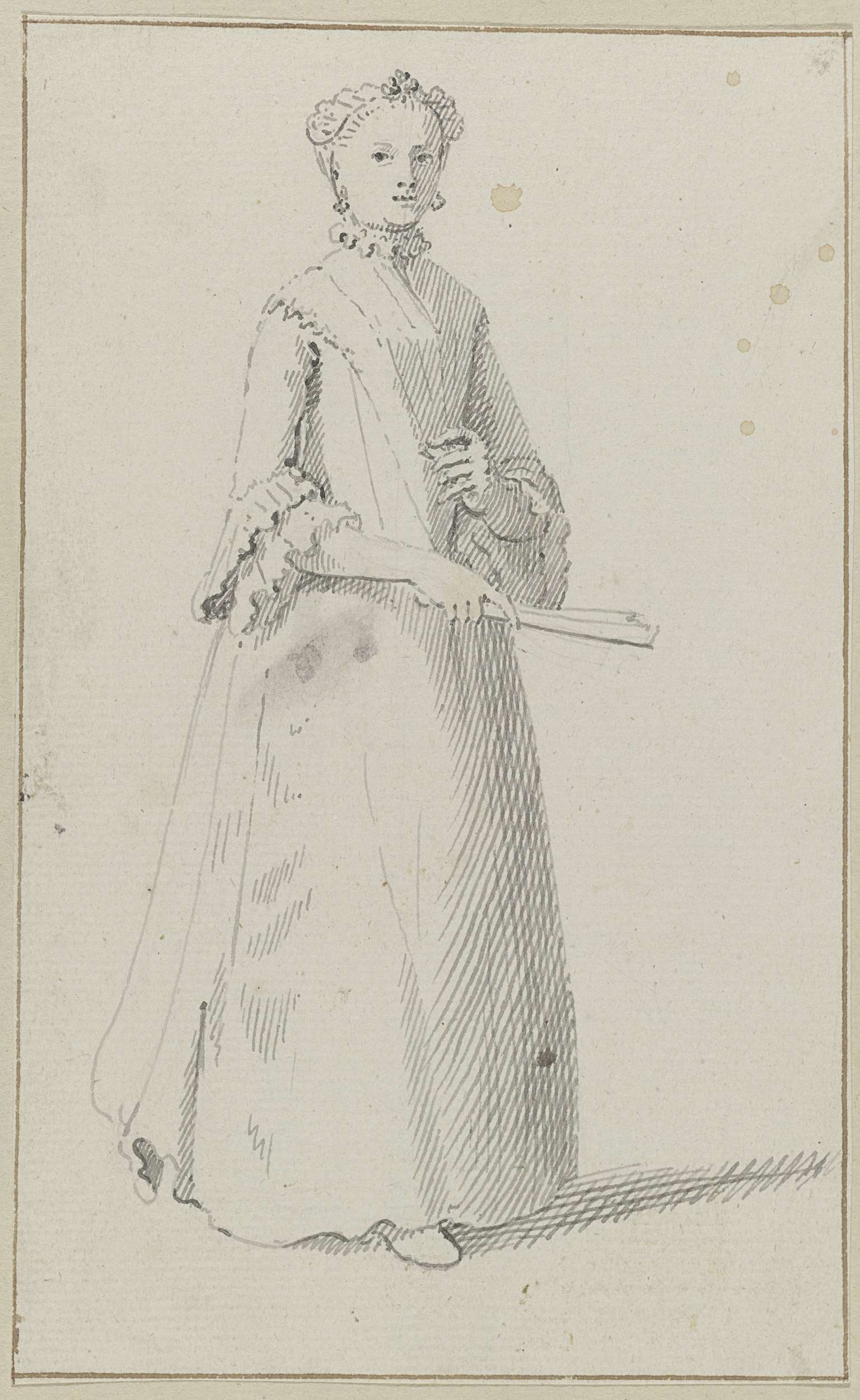 Staande vrouw met gevouwen waaier in haar hand