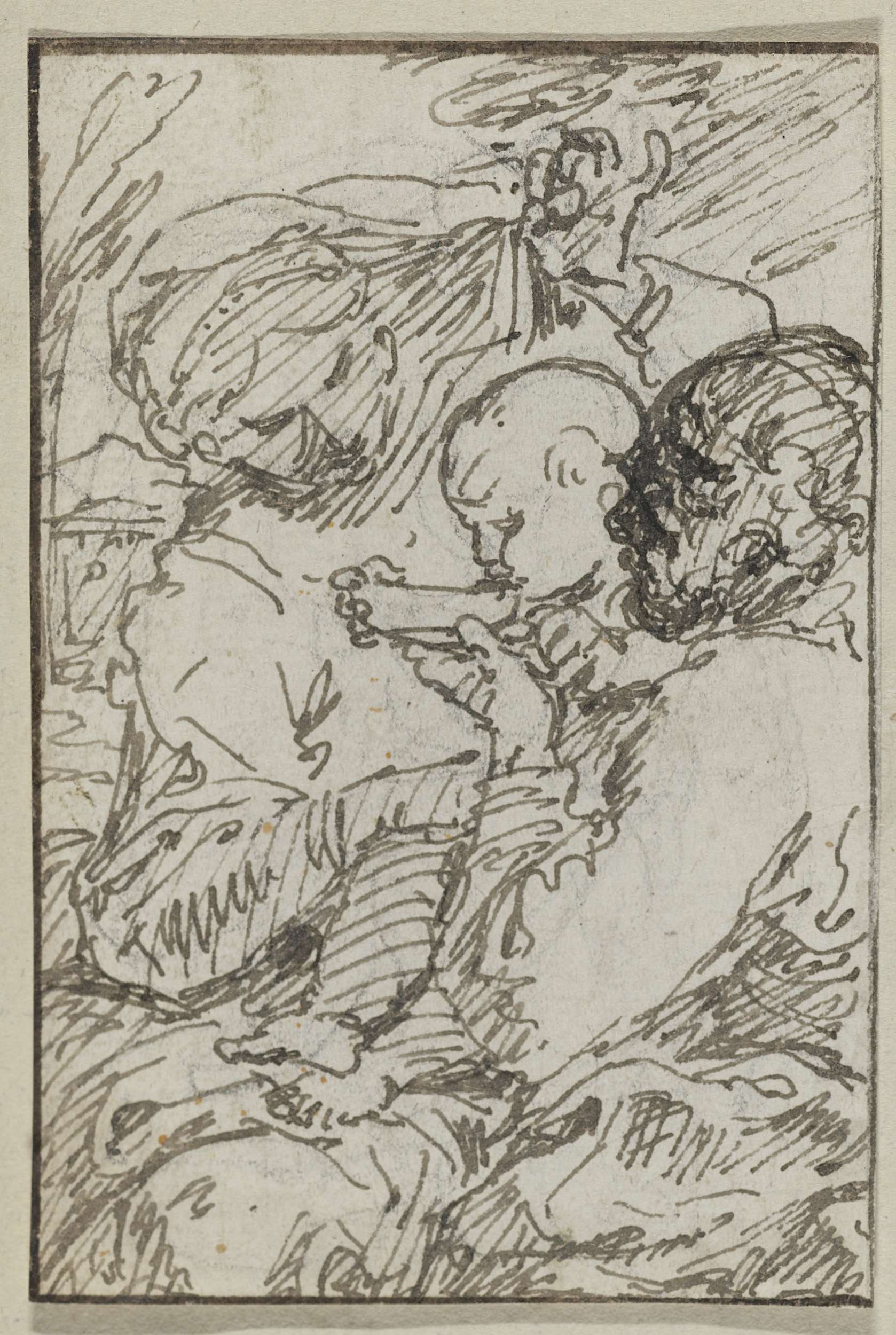 Twee naakte mannen en een stier en een liggende leeuw