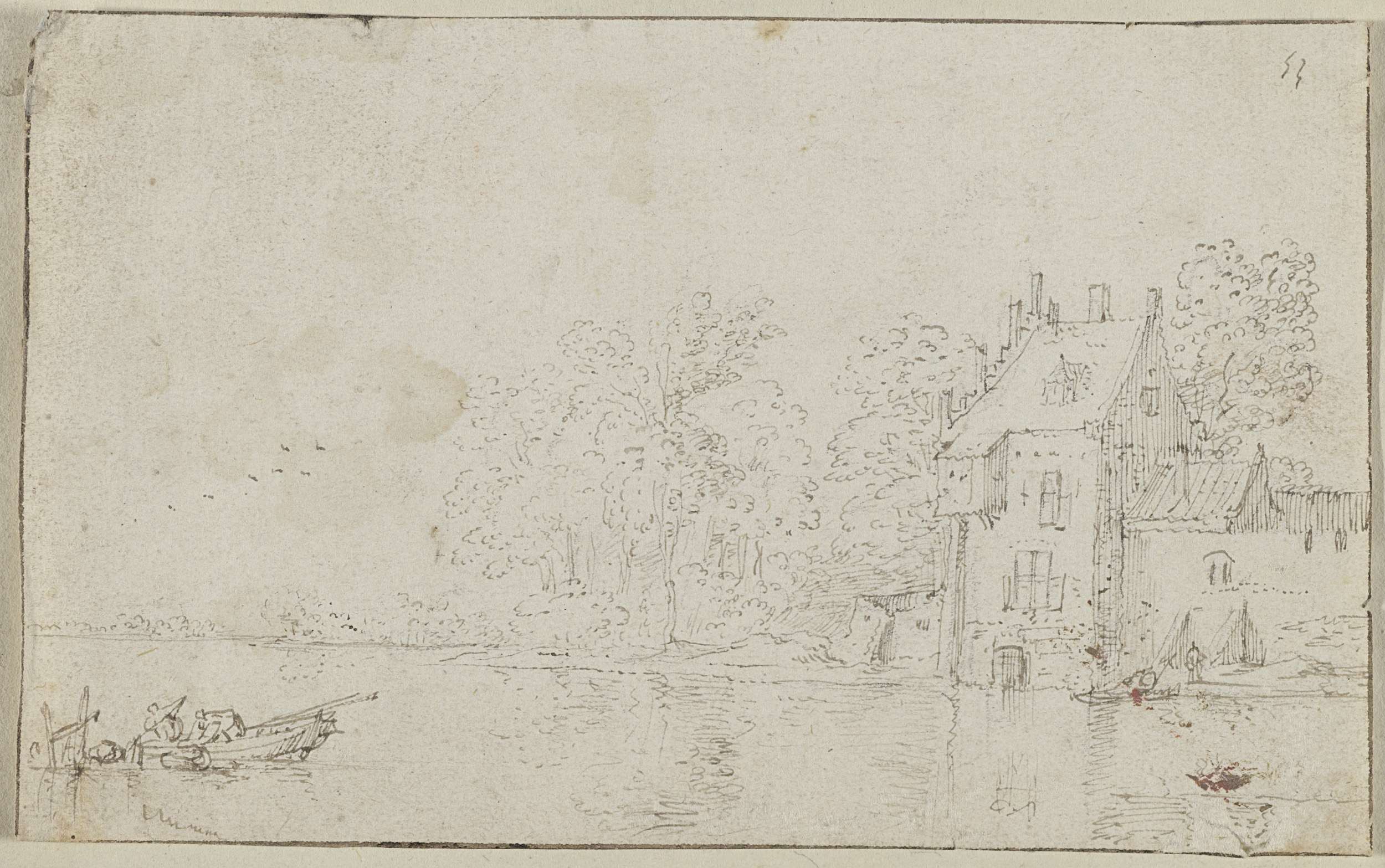 Huis tussen geboomte aan een oever