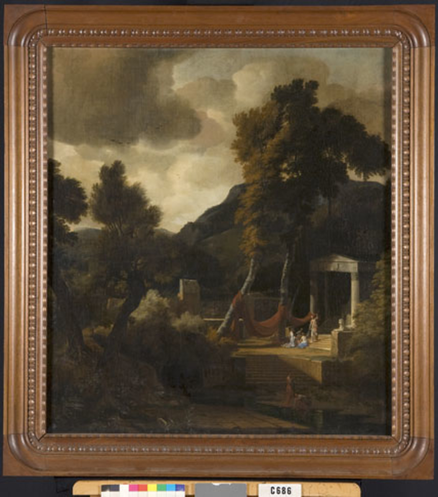 Klassiek landschap met tempel en figuren