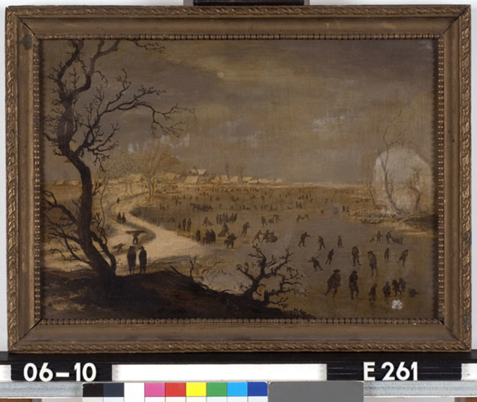 Gezicht op een bevroren rivier met schaatsers