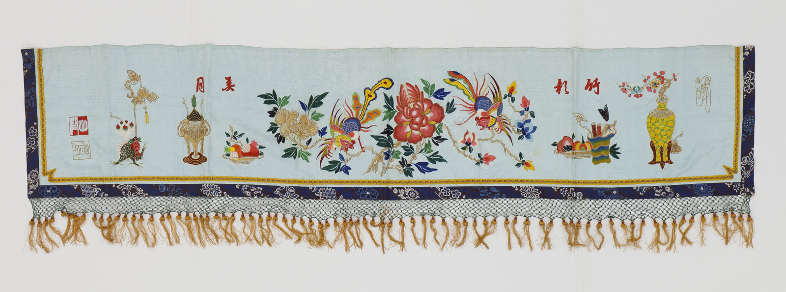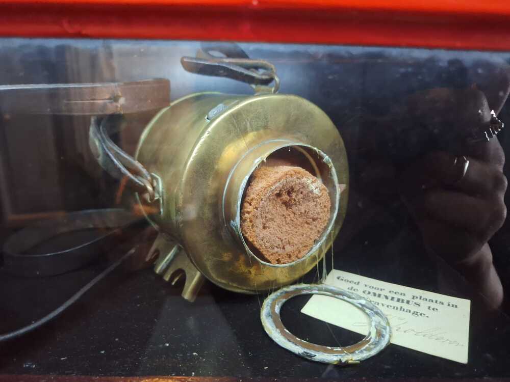 Ronde kaartjestrommel aan een riem, aan de zijkant o...